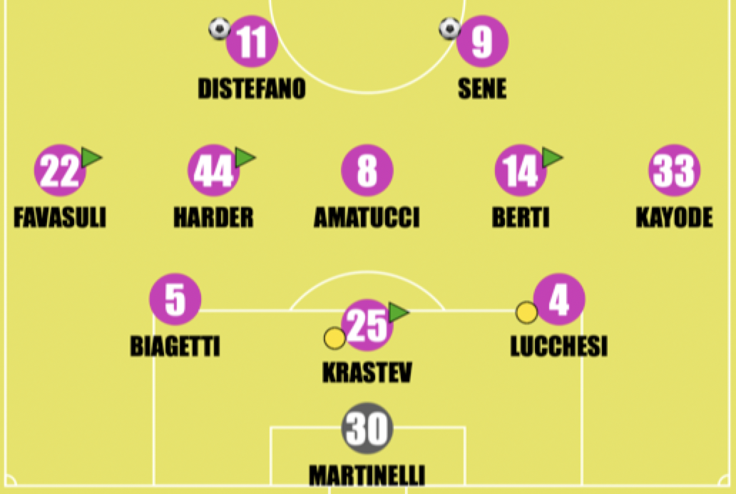 FIORENTINA (3-5-2): Martinelli 5.5, Lucchesi 6, Krastev 5 (14' st Capasso), Biagetti 5.5, Kayode 5.5, Berti 6.5 (24' st Presta), Amatucci 6.5, Harder 5.5 (37' st Vitolo), Favasuli 6 (37' st Toci), Sene 5, Distefano 6.5. A disp. Dolfi, Romani, Nardi, Gentile, Rubino, Comuzzo. All. Aquilani 6.