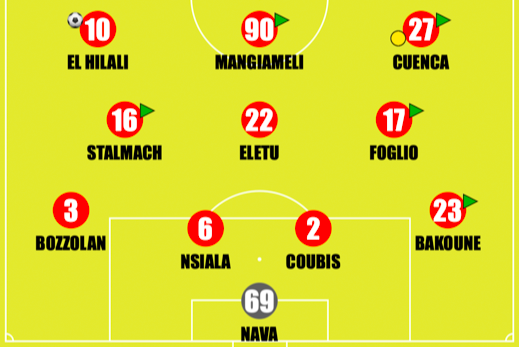 Il 4-3-3 di Ignazio Abate • Davanti a Nava ci sono Bakoune e Bozzolan esterni con Coubis e Nsiala - ottima prova la sua - centrali; in mediana Eletu viene riportanto in mezzo con Foglio a dare sostanza sul centro-destro e con Stalmach a dare qualità e inserimenti dall'altra parte. In attacco El Hilali parte decentrato con Mangiameli a fare il "vero nueve" e con Cuenca a completare il tridente