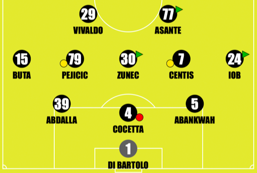 Il 3-5-2 di Jani Surm • Abankwah, Cocetta e Abdalla spostato a sinistra formano il terzetto difensivo con Iob e destra e Buta a sinistra che trasformano la retroguardia da 3 a 5 a seconda delle esigente. Zunec è il riferimento centrale in mediana con Centis e Pejicic che agiscono da mezzali, davanti il tandem Vivaldo-Asante
