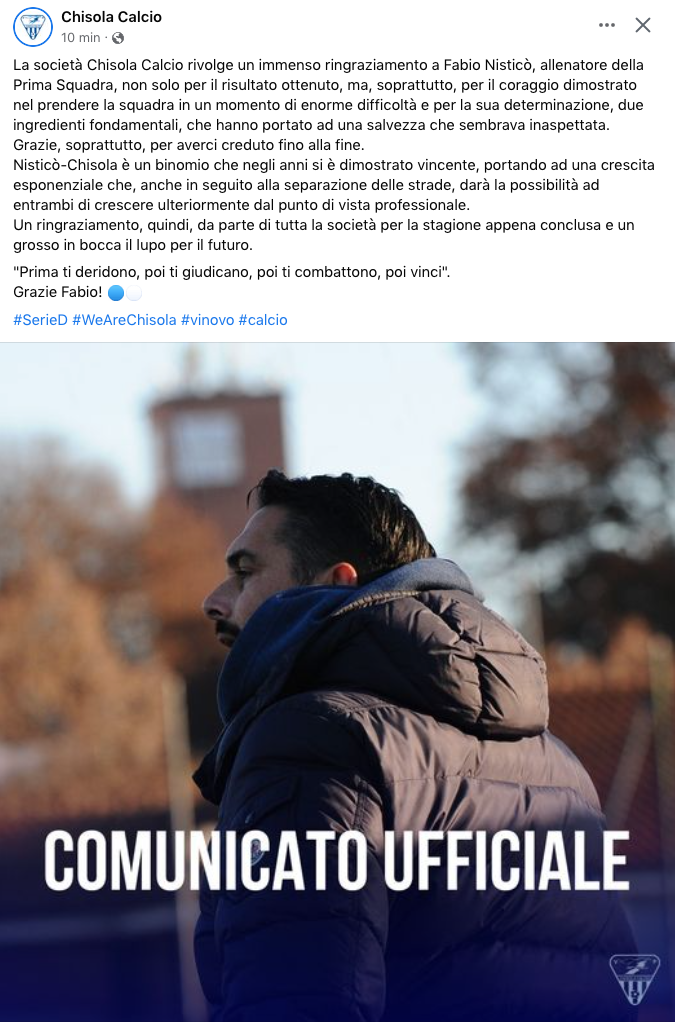 «Quello che abbiamo fatto ed è stato fatto con la salvezza, è stato un vero e proprio miracolo sportivo, che resta e rimarrà qualcosa di unico e speciale per tutti. Un grazie a Fabio Nisticò, che si è confermato un grandissimo allenatore e una splendida persona e al Direttore Sportivo Nunzio Lazzaro con cui in due anni abbiamo vissuto un sogno, prima con la promozione in Serie D e poi con questa salvezza incredibile. Come detto però poi, nell’ottica societaria, bisogna fare delle valutazioni che esulano e prescindono dalle situazioni e dai rapporti personali e nella chiacchierata con Nisticò e Lazzaro, questo è stato il denominatore comune».