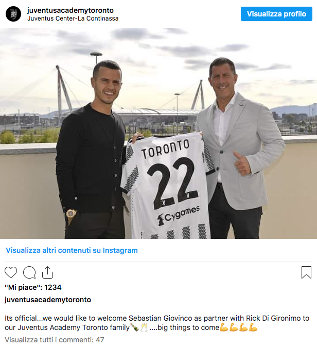 La Toronto Academy affiliata Juventus diretta da Sebastian Giovinco e Rick Di Gironimo (in foto nel tweet che annunciò l'affiliazione al club bianconero) sbarca in Italia: collaborazione col Chisola