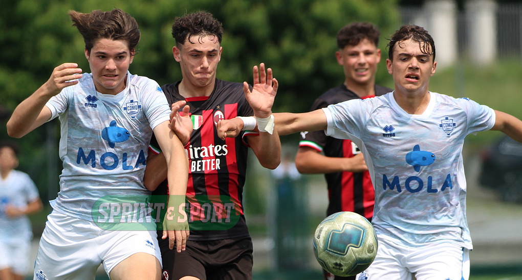 COMO-MILAN UNDER15 • La Mantia, centrocampista del Milan, stretto nella morsa Bergamini-Villa