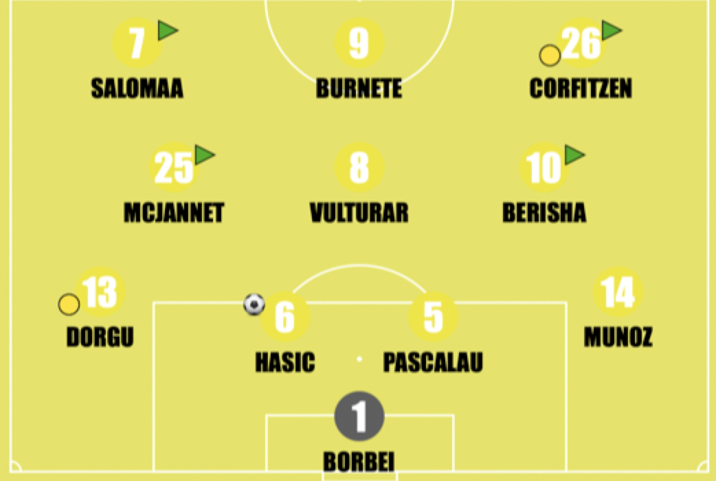 Il 4-3-3 di Federico Coppitelli • L'unico ballottaggio viene risolto in favore di McJannet, unico innesto - al posto di Samek - rispetto alla semifinale col Sassuolo. Tutti confermati gli altri: solita difesa con Munoz, Pascalau, Hasic e Dorgu davanti a Borbei; Vulturar regista, Berisha mezzala e tridente classico con Corfitzen e Salomaa ai fianchi di Burnete