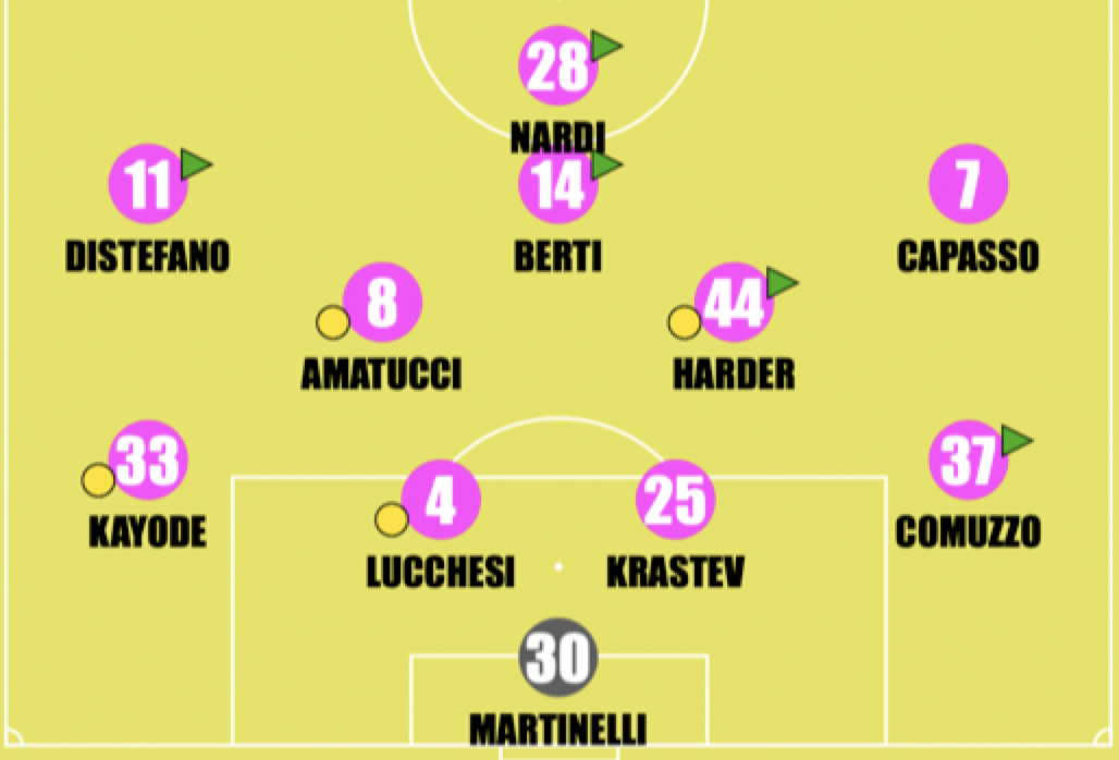 Il 4-2-3-1 di Alberto Aquilani • Sistema di gioco "liquido" con Comuzzo-Krastev-Lucchesi-Kayode quartetto difensivo, Capasso e Distefano alti sulle corsie, Harder e Amatucci in mezzo al campo con Berti che agisce sulla trequarti alle spalle di Nardi, preferito a Toci e Sene