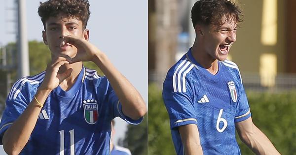 ITALIA UNDER 16 • Due esultanze Azzurre: a sinistra Samuele Inacio, attaccante dell'Atalanta; a destra Luca Reggiani, difensore del Sassuolo (foto figc.it)
