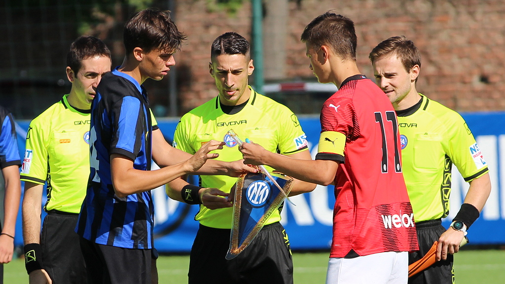 INTER-MILAN UNDER 18 • Zanchetta e Siman, capitani di Inter e Milan, agli ordini di Vailati della Sezione di Crema