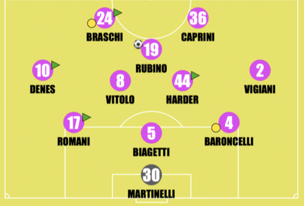 FIORENTINA-MILAN PRIMAVERA 1 • Martinelli prende il posto di Vannucchi tra i pali, in difesa c'è Romani al posto di Scuderi con Biagetti e Baroncelli; Denes a sinistra completa la solita mediana con Vitolo e Harder centrali e con Vigiani a tutta fascia dall'altra parte; davanti, rispetto alla gara col Cagliari, c'è Rubino dietro al tandem Braschi-Caprini