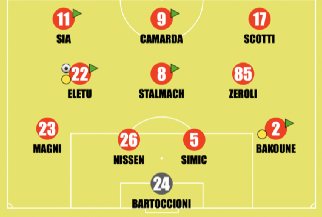 AMMONITI: Eletu (M), Bakoune (M), Gudelevicius (F), Braschi (F), Baroncelli (F).