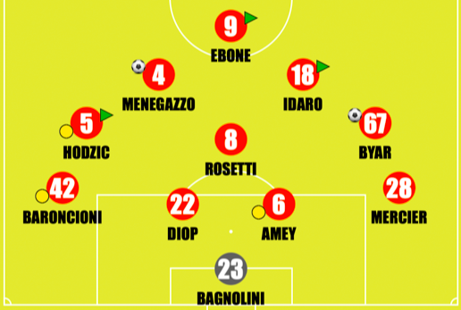 Il 4-3-2-1 di Luca Vigiani • Diop a Amey davanti a Bagnolini con Mercier e Baroncioni sugli esterni, in mediana Rosetti gioca in mezzo con Byar e Hodzic ai suoi lati, davanti Idaro - all'esordio da titolare - e Menegazzo a ispirare il centravanti Ebone