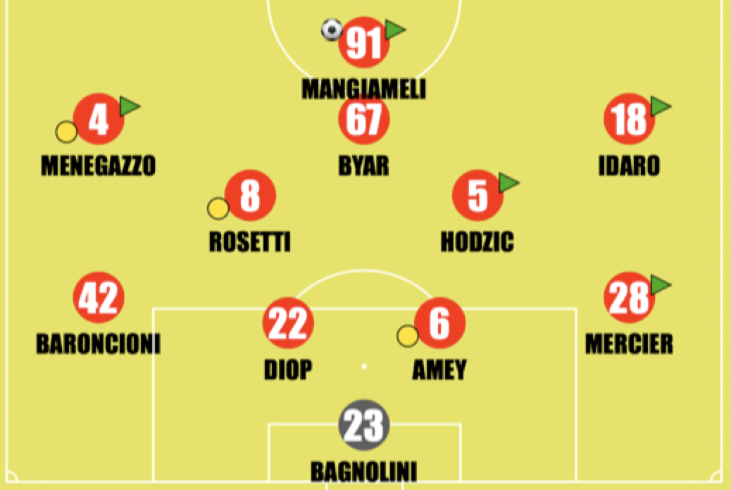 Il 4-2-3-1 di Luca Vigiani • Dieci undicesimi confermati rispetto al pareggio con l'Atalanta: cambia però la punta, con Mangiameli al posto di Ebone, e il sistema di gioco con Byar che piò che da mezzala come a Bergamo agisce da trequartista nel terzetto offensivo completato da Idaro a destra e Menegazzo a sinistra. Davanti a Bagnolini la solita linea a 4 con Mercier e Baroncioni sulle corsie e Amey-Diop coppia centrale; in mezzo al campo Hodzic e Rosetti