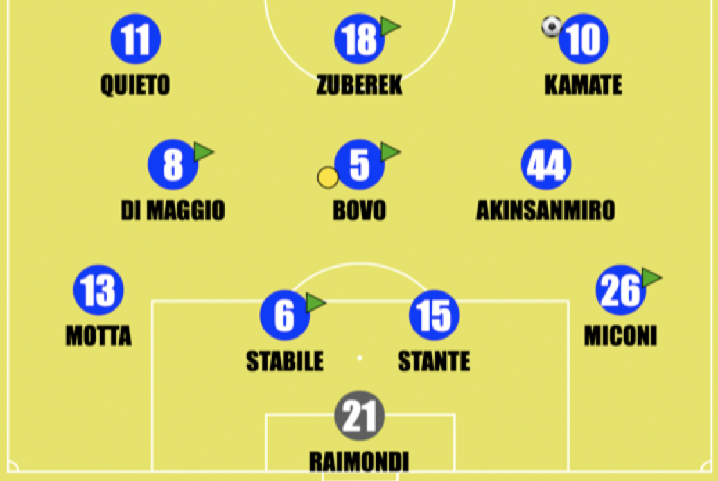 Il 4-3-3 di Cristian Chivu • Cinque cambi rispetto all'uscita in Youth League contro il Salisburgo, con il tecnico rumeno costretto evidentemente a far ruotare alcuni elementi visto il doppio impegno settimanale. Escono dall'undici titolare Calligaris (in porta gioca Raimondi), Aidoo e Matjaz (al loro posto Miconi e Stabile), Stankovic (torna Akinsanmiro) e Sarr: esordio dal primo minuto per Zuberek, finalmente rientrato a piena disposizione dopo l'infortunio nell'ultima Supercoppa contro la Fiorentina che lo ha tenuto lontano dal campo per diversi mesi