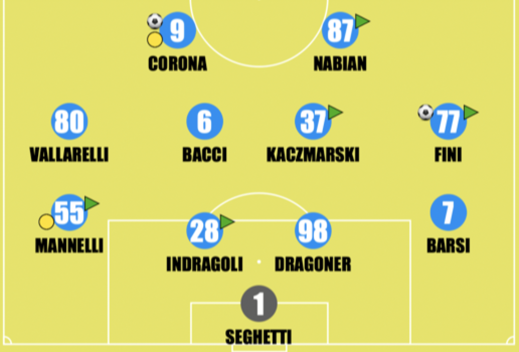 Il 4-4-2 di Alessandro Birindelli • Tra i pali c'è Seghetti al posto di Stublijar, difesa a quattro con Barsi e Mannelli sulle fasce e Dragoner e Indragoli in mezzo; prima da titolare per Fini che parte esterno a destra con Vallarelli a sinistra e la coppia Bacci-Kaczmarki a dirigere le operazioni; in attacco la solita coppia Corona-Nabian