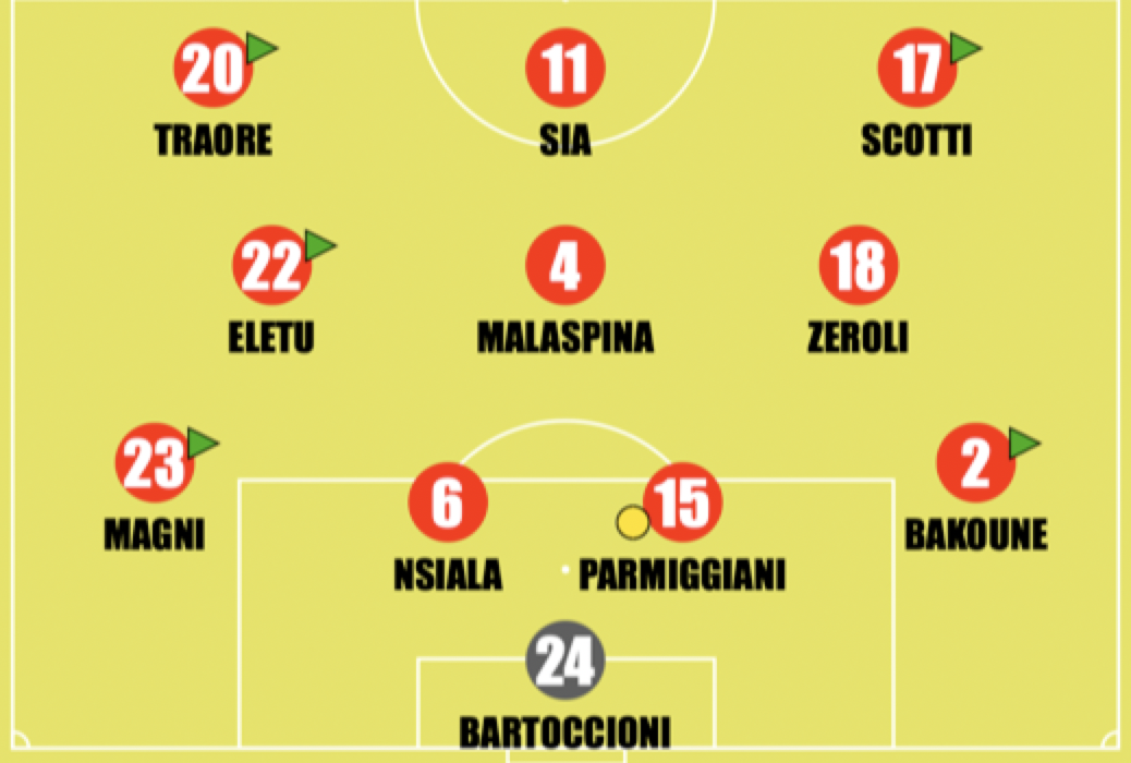 Il 4-3-3 di Ignazio Abate • L'ago della bilancia tra il centrocampo a tre e il 4-2-3-1 è sempre Zeroli, che stavolta agisce più da mezzala che da trequartista. Rispetto alla partita con la Samp, davanti a Bartoccioni con Nsiala c'è Parmiggiani, vista la promozione di Simic in prima squadra: ai loro lati Bakoune e Magni, con la solita coppia in mediana Eletu-Malaspina. In attacco Scotti e Traore sulle corsie esterne, Sia centravanti.