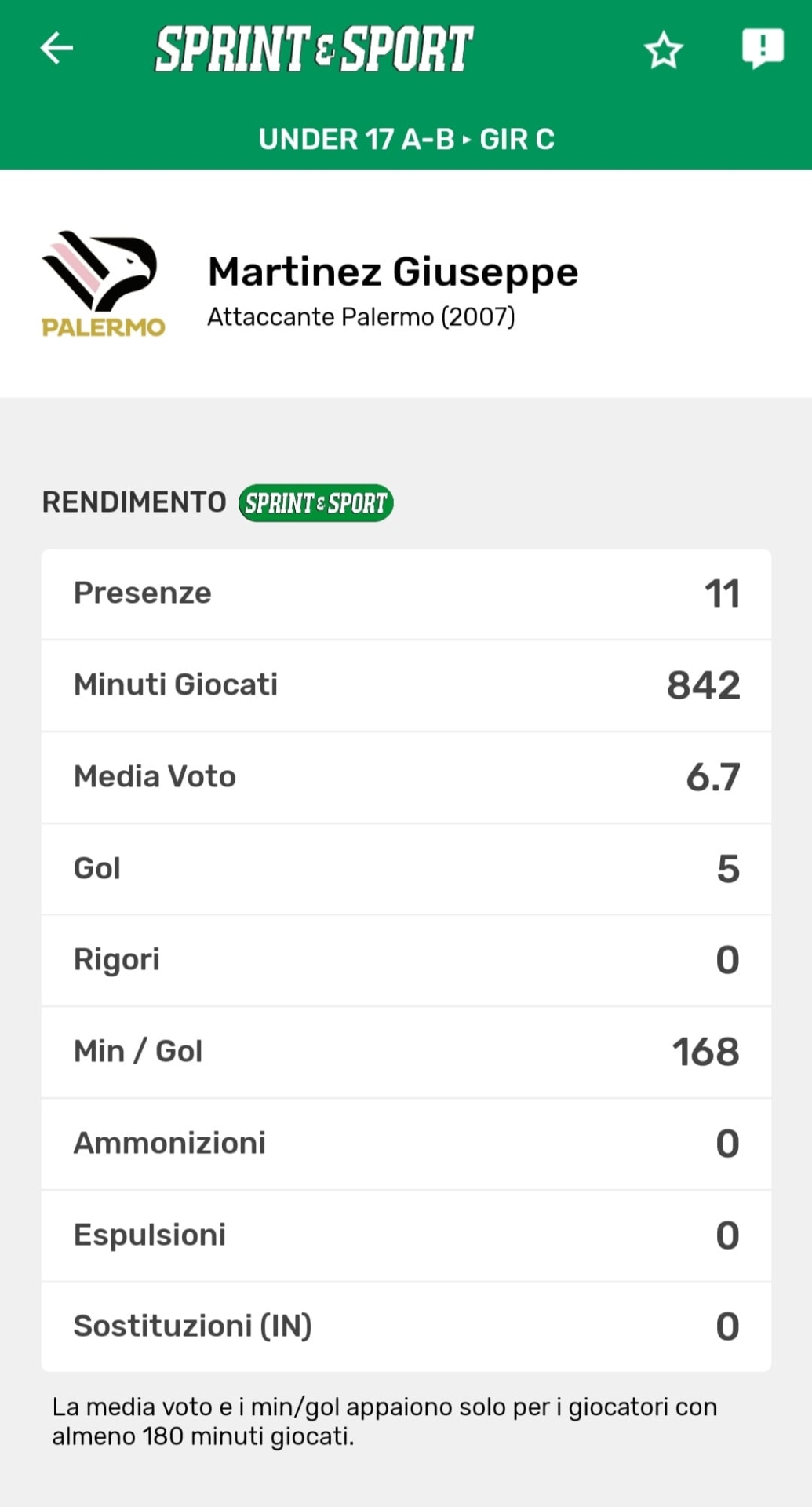 Dopo l'ottavo posto con 19 punti raggiunti lo scorso anno, i 2007 del Palermo stanno viaggiando a grande velocità: con una media di 2.1 punti conquistati, i rosanero occupano la quinta posizione in solitaria con 23 lunghezze (+4 dal Frosinone e a -2 dall'Empoli quarto). Manco a dirlo, Vaccaro è il capocannoniere del Girone C con 17 gol stagionali, alle spalle di Stefano Maiorana di una Fiorentina che vola spedita al primo posto.