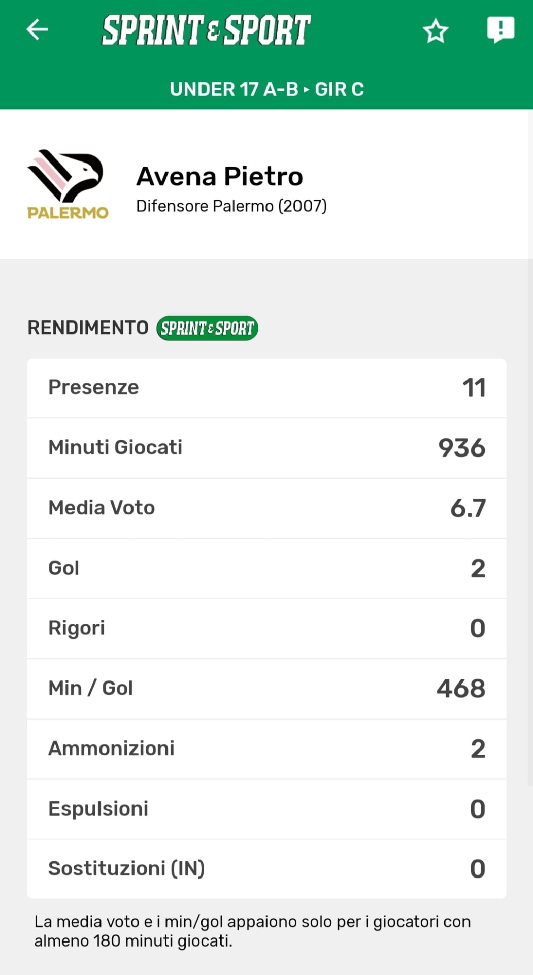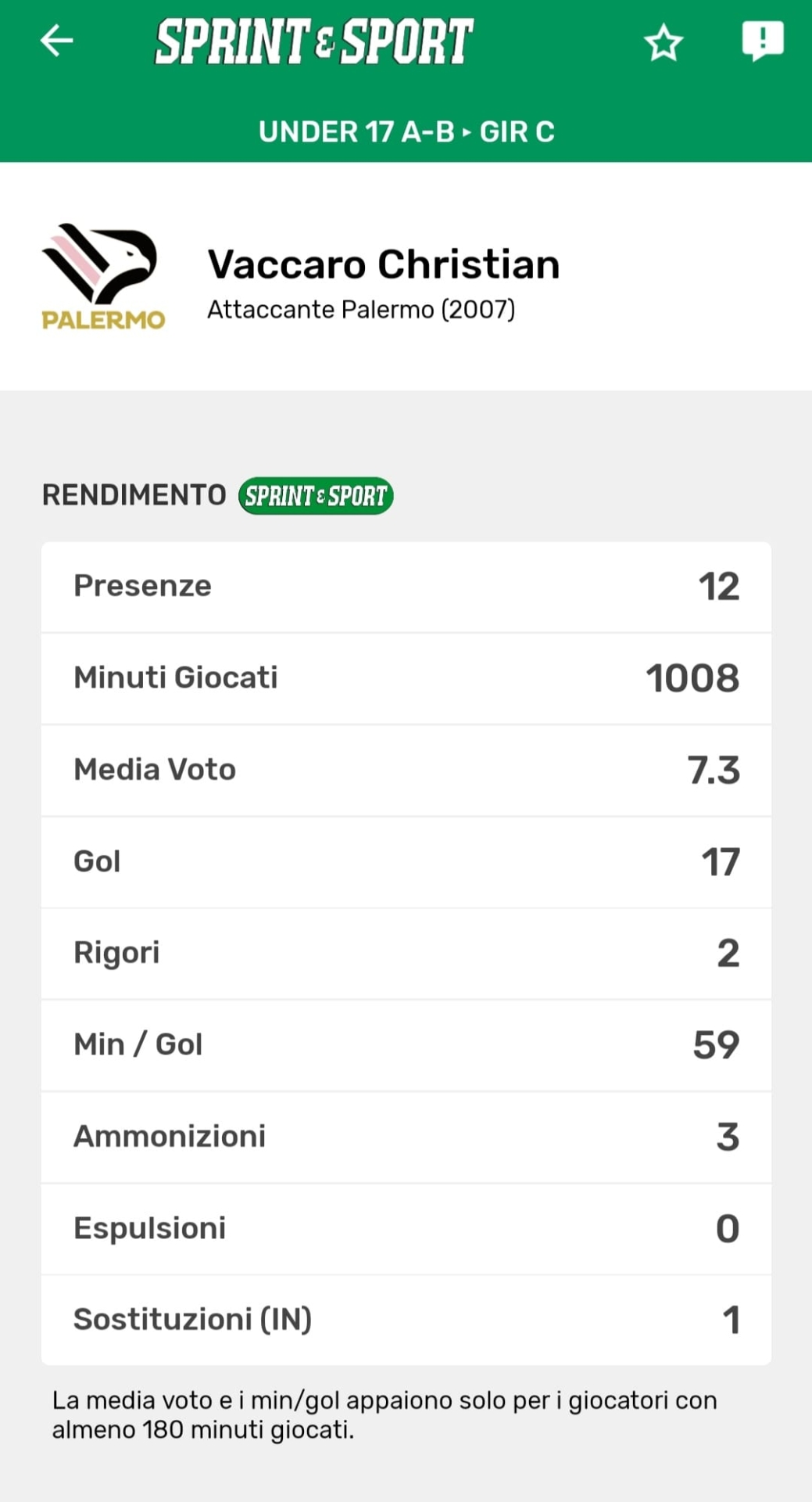 Dopo l'ottavo posto con 19 punti raggiunti lo scorso anno, i 2007 del Palermo stanno viaggiando a grande velocità: con una media di 2.1 punti conquistati, i rosanero occupano la quinta posizione in solitaria con 23 lunghezze (+4 dal Frosinone e a -2 dall'Empoli quarto). Manco a dirlo, Vaccaro è il capocannoniere del Girone C con 17 gol stagionali, alle spalle di Stefano Maiorana di una Fiorentina che vola spedita al primo posto.