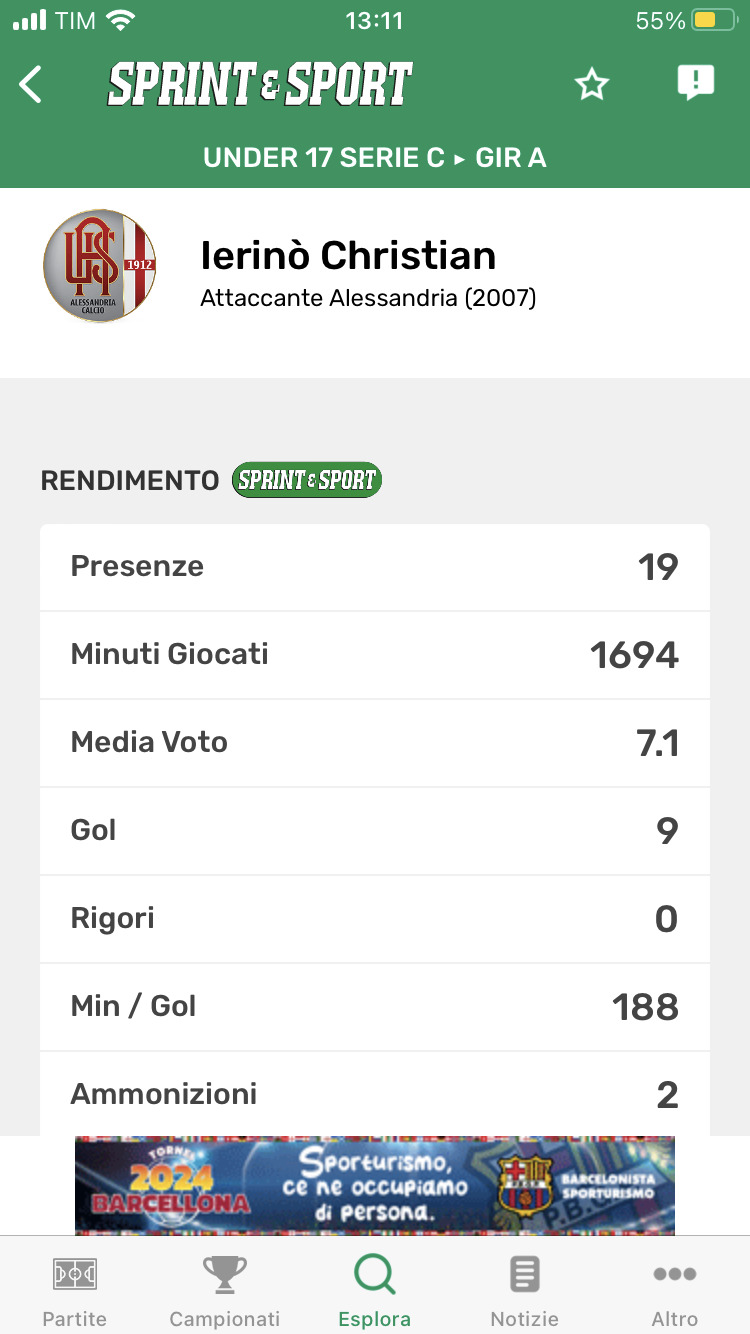 Quella passata è stata per Ierinò l’annata di consacrazione: tra tutte e due le categorie segna più di trenta gol e registra altrettanti assist, ma cosa più importante, si porta a casa entrambi i campionati. Nel giugno scorso, ecco però l’ennesimo ritorno al Torino: i granata lo provano, lo valutano, ma non lo reputano pronto a tal punto da essere aggregato con l’Under 17. Questa volta però, contrariamente agli anni passati, la dirigenza dei torelli opta per un trasferimento a titolo definitivo attraverso uno scambio con l’Alessandria. Così facendo, Cristian si ritrova in un nuovo ambiente in cui ha tutto da dimostrare. Nessun problema però, il ragazzo fa in modo che siano le sue prestazioni a parlare per lui: nove gol e otto assist in diciotto presenze con l’Alessandria Under 17, numeri che gli sono recentemente valsi la chiamata del Lecce il quale, gli scorsi 20, 21 e 22 febbraio, lo ha sottoposto ad un provino direttamente nella città salentina. Al di là di quelle che saranno le valutazioni della compagine leccese, la cosa certa è che la carriera calcistica di Cristian Ierinò ha tutte le carte in regola per diventare quella di un calciatore destinato a calcare grandi palcoscenici.