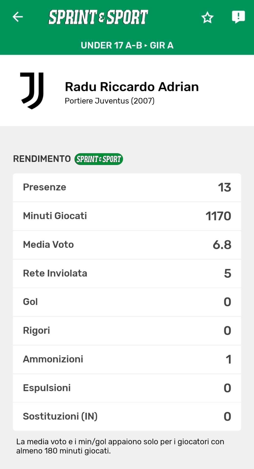 Under 17 A-B: Il portiere della Juventus Riccardo Radu . Il classe 2007 ha appena firmato il suo primo contratto da professionista fino al 2026.