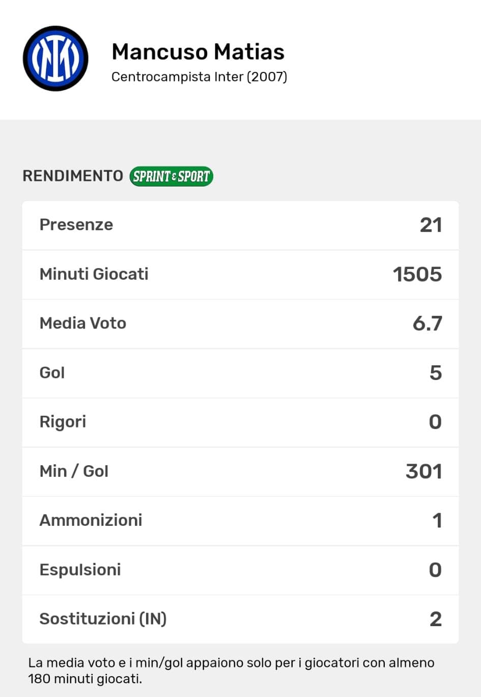 Nell'ultima trasferta a Monza, Mancuso ha dimostrato ancora una volta il suo valore. Non solo ha contribuito alla vittoria dell'Inter, ma ha anche impressionato con la sua maturità e la sua personalità in campo. Nonostante sia descritto come un ragazzo timido fuori dal campo, in partita Mancuso non ha mai paura di prendersi la responsabilità, sia a parole che con i fatti. Ecco allora che la convocazione in prima squadra da parte di Inzaghi non è stata una sorpresa per chi conosce bene Mancuso. Il giovane centrocampista ha dimostrato di saper gestire la pressione e di essere pronto per il grande salto. E l'Inter crede fortemente nelle sue qualità. Non a caso, Mancuso ha già firmato il suo primo contratto da professionista, che lo legherà ai nerazzurri almeno fino al 2025. L'obiettivo di Mancuso è chiaro: continuare a crescere e a migliorare, per strappare una chiamata da Massimiliano Favo, ct dell'Italia, in vista degli Europei Under 17. E, perché no, magari un giorno poter scendere in campo con la maglia della Prima Squadra dell'Inter durante le gare ufficiali.