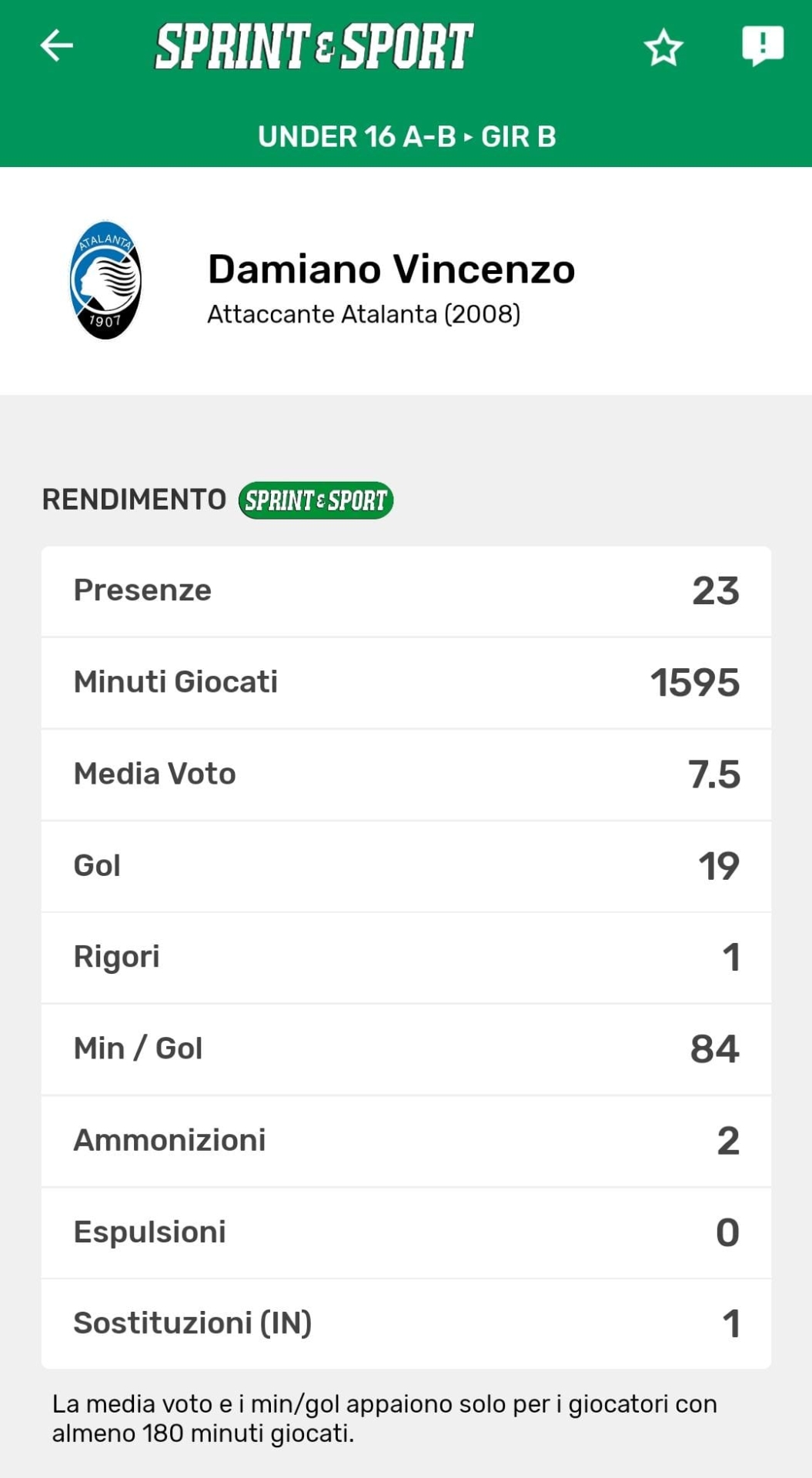 Il Settore Giovanile della Dea, anno dopo anno, si sta confermando sempre più propositivo e continua a sfornare un talento dopo l'altro; nella formazione Under 16 ce n'è uno che si è consolidato questa stagione e che sicuramente, in futuro, farà parlare di sé: Vincenzo Damiano. Con i suoi 19 gol in 23 partite (uno solo su rigore) è il capocannoniere del Girone B e il miglior giocatore per rapporto di minuti in rete (un gol ogni 84 minuti) ed è inoltre colui con la media voto più alta tra i tre gruppi con 7.5. Senza dubbio, gli occhi della difesa granata saranno puntati tutti su di lui.