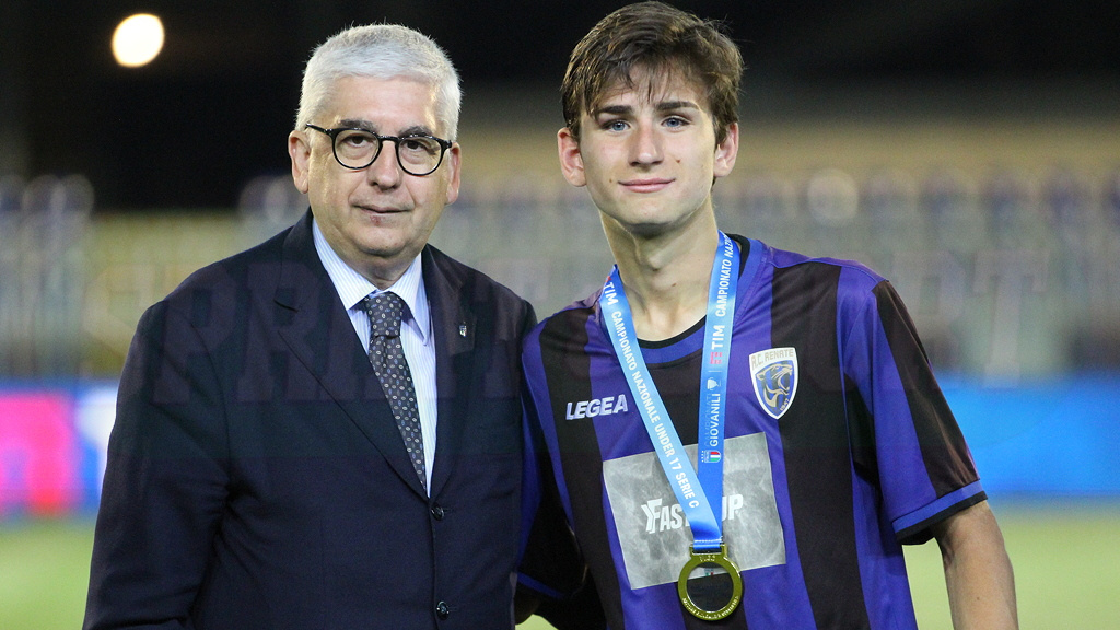 RENATE-ANCONA UNDER 17 SERIE C • Diego Stagi in posa con Vito Tisci, presidente del Settore Giovanile e Scolastico, al momento della consegna delle medaglie