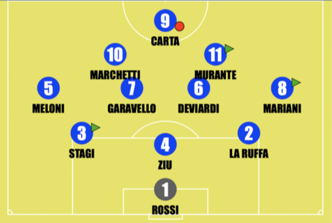 RENATE PRIMAVERA 2 • Savoldi opta per un 3-4-2-1 con Carta unica punta e Murante e Marchetti alle sue spalle. In mediana solita coppia Deviardi-Garavello, sulle fasce Meloni a sinistra e Mariani a destra. Davanti a Rossi, il trittico inamovibile La Ruffa-Ziu-Stagi.