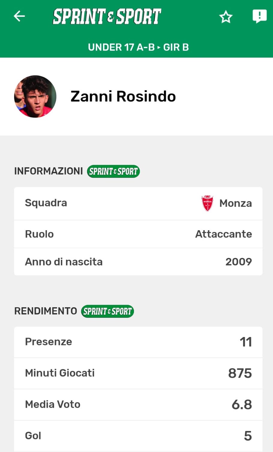 I numeri di Rosindo Zanni in Under 17: scarica la App per tutte le statistiche individuali e di squadra di tutti i campionati nazionali