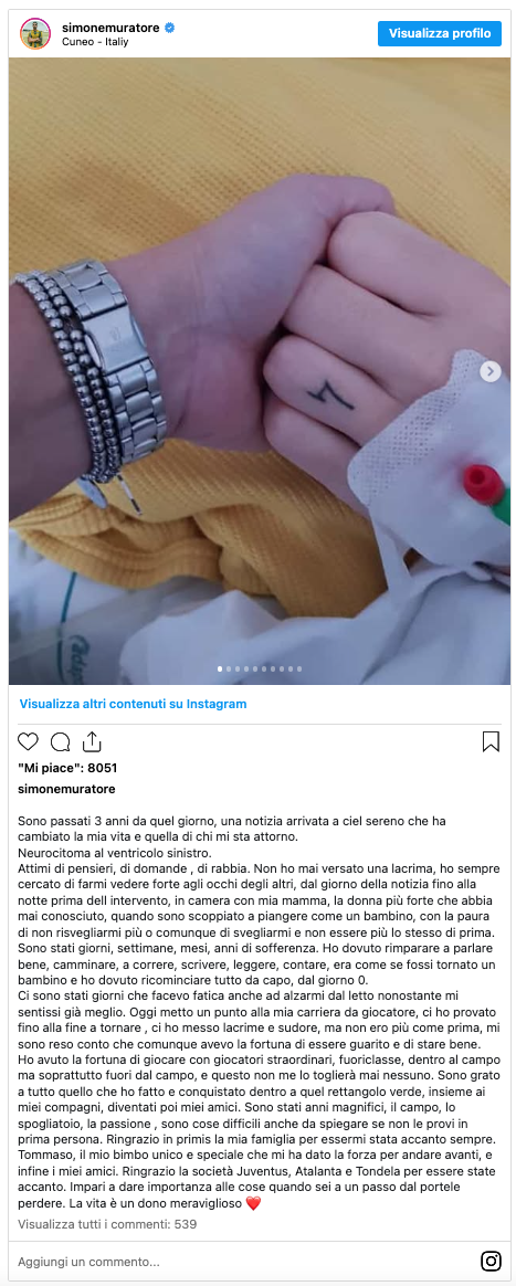 Simone Muratore, a 26 anni, ha annunciato il suo ritiro dal calcio giocato a causa di un tumore, con un post commovente sui social: "Impari a dare importanza alle cose quando sei a un passo dal perderle". Nonostante la fine prematura della sua carriera, la Juventus ha deciso di non lasciarlo solo, offrendogli un contratto come collaboratore tecnico nel settore giovanile del club.