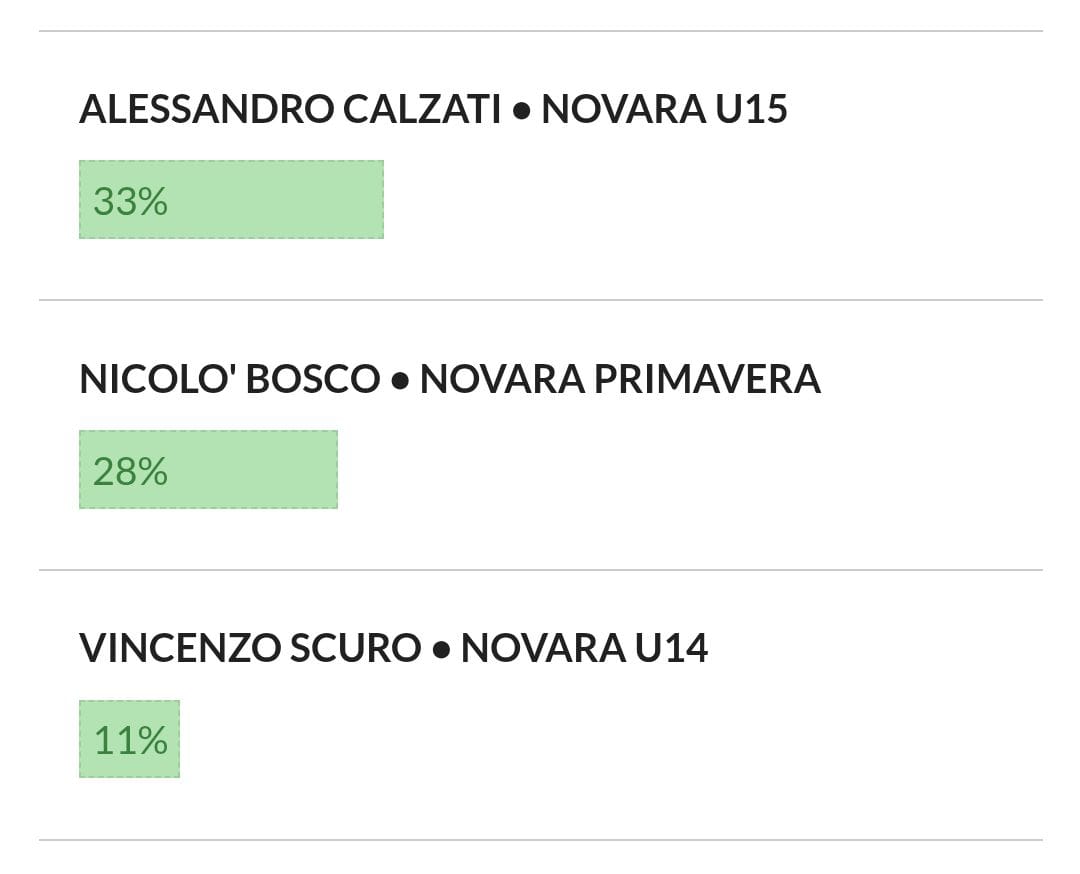 Come anticipato, la lotta per eleggere l'MVP del Novara è stata apertissima, ma col 33,49% dei voti totali il vincitore è il bomber classe 2010. Segue Nicolò Bosco della Primavera con il 27,54% dei voti e al terzo posto, ma molto più distaccato rispetto ai primi due, con 444 voti equivalenti al 10,92%, si piazza Vincenzo Scuro dell'Under 14.