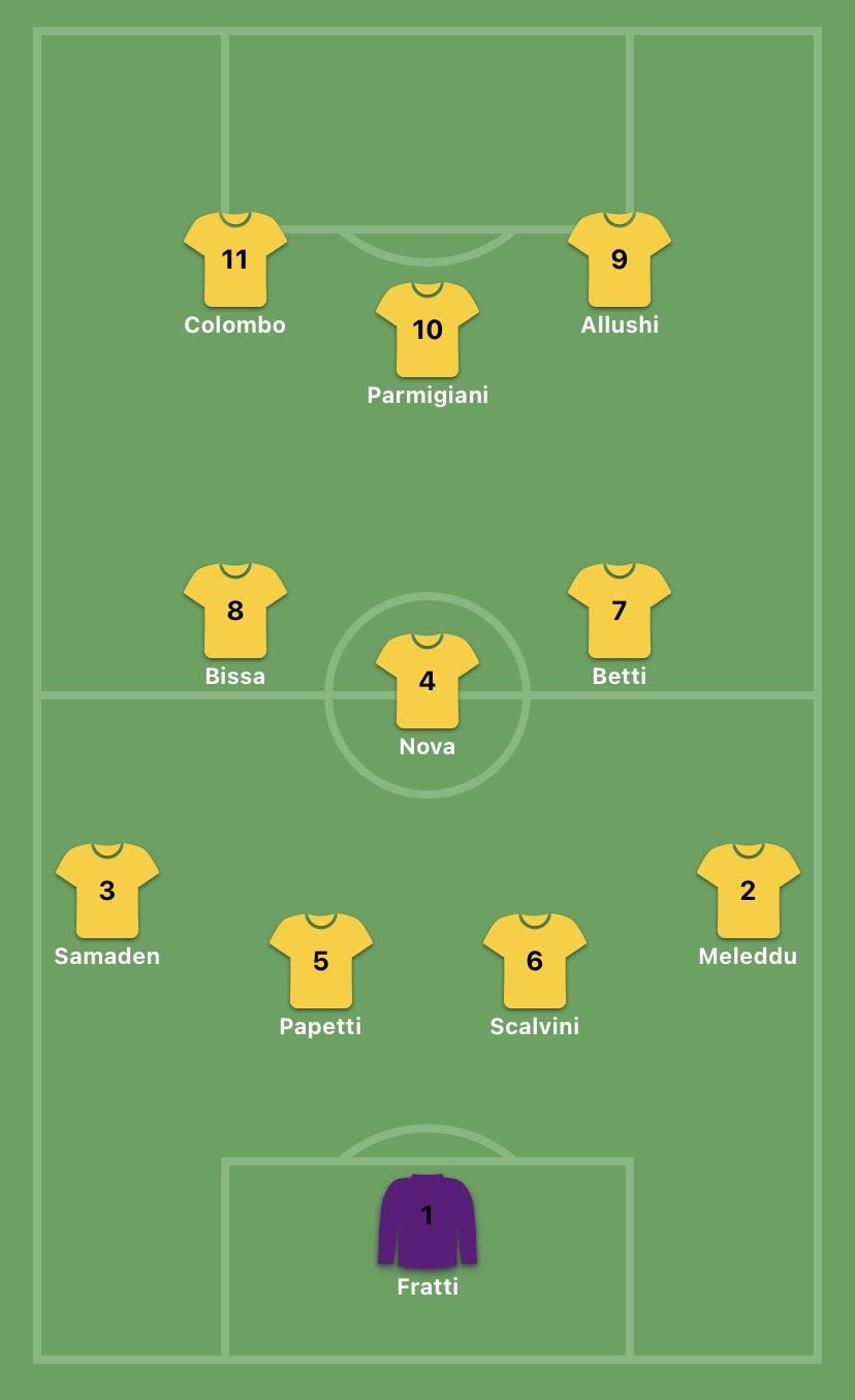 Partendo dal buon vecchio 4-3-3, iniziamo subito con i migliori del Girone A. La porta non può che essere difesa da Cristiano Fratti, estremo difensore del Mantova protagonista della stagione dei biancorossi con ben 7 clean sheet. La linea difensiva a quattro è composta dalla coppia Papetti-Scalvini, entrambi del Lumezzane. Il primo si è fatto notare anche da Franzini, tecnico della prima squadra che lo ha fatto esordire in Serie C. Il classe 2006 ha invece fatto uno step, diventando uno dei fedelissimi di Ugolini. Sulle fasce abbiamo Meleddu, terzino di spinta del Lecco e Samaden, classe 2006 ex Como. A centrocampo non può mancare Betti, autore di 5 gol con la Carrarese. Al suo fianco spazio a un'altra Aquila, Nova e a Bissa della Pergolettese. L'attacco è un totale di 15 gol con Parmigiani, Allushi e Colombo, rispettivamente di Pergolettese, Mantova e Pro Patria.