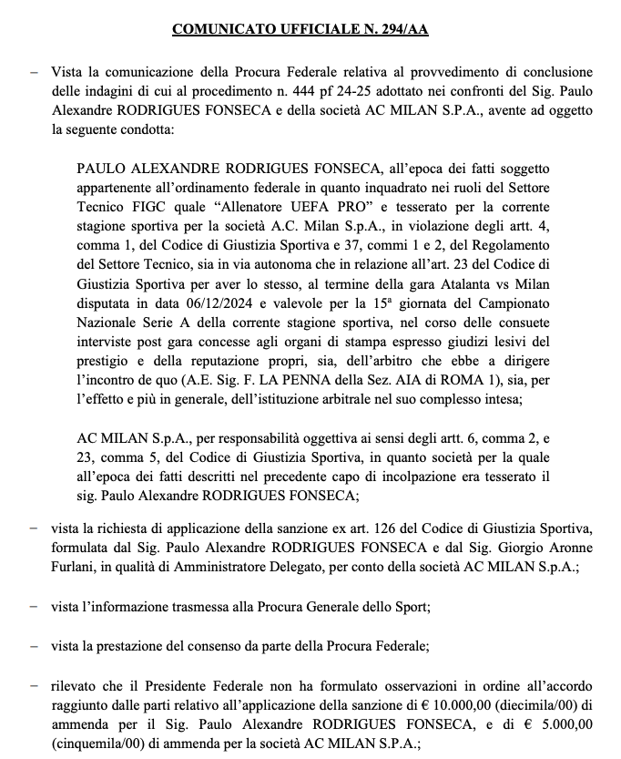 COMUNICATO UFFICIALE N. 294/AA − Vista la comunicazione della Procura Federale relativa al provvedimento di conclusione delle indagini di cui al procedimento n. 444 pf 24-25 adottato nei confronti del Sig. Paulo Alexandre RODRIGUES FONSECA e della società AC MILAN S.P.A., avente ad oggetto la seguente condotta: