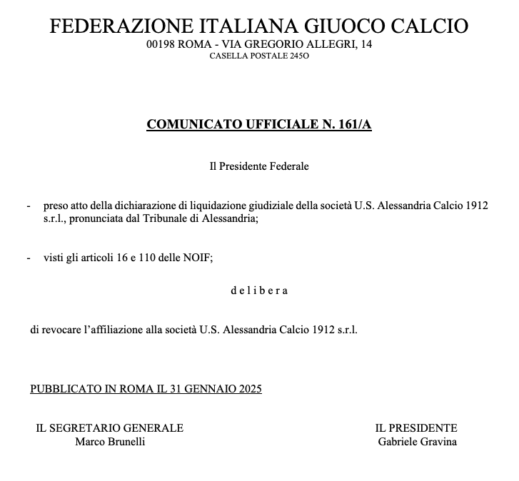Come inevitabile e immediata conseguenza, è arrivata anche la cancellazione della matricola storica del club Alessandria Calcio 1912 ad opera della Figc con revoca dell'affiliazione della società.