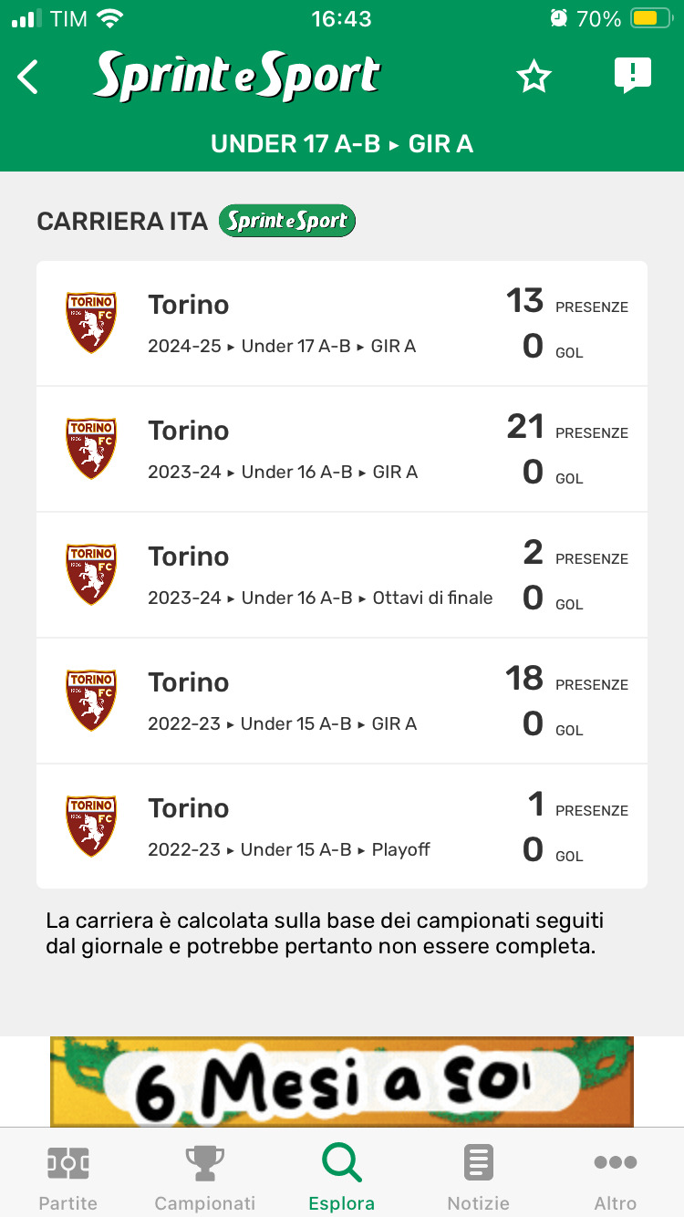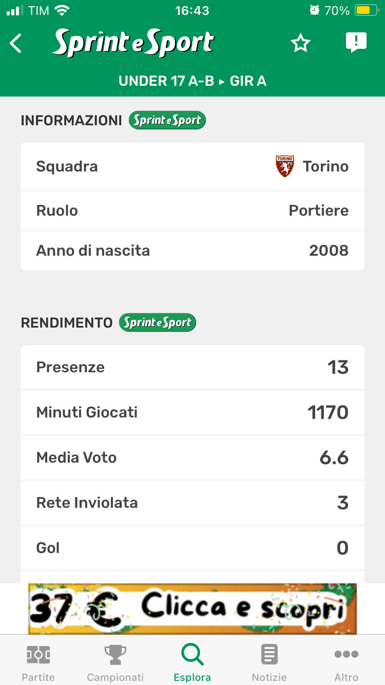 I NUMERI DELLA STAGIONE E LA CARRIERA IN GRANATA DI FRANCESCO CERESER DALL'APP DI SPRINT E SPORT