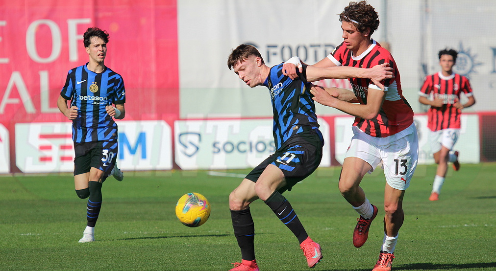 Metà viso rossonero, metà viso nerazzurro. Dopo i tre derby di settimana scorsa (uno vinto dall'Inter, uno vinto dal Milan, uno pareggiato), la Madonnina aspettava la resa dei conti per capire con quali colori si dovesse presentare in piazza Duomo. Alla fine, nulla di fatto. Milan e Inter non vanno oltre l'1-1 in una partita tosta ma non particolarmente emozionante, ma comunque calda negli animi - come ogni buon derby che si rispetti - e ricca di contenuti. Come il rigore per l'Inter, contestatissimo dalla panchina rossonera e trasformato da Berenbruch; come l'1-1 di Perrucci che a inizio ripresa rimette tutto a posto su assist di Liberali; come il bollente finale, con un immenso parapiglia che coinvolge un po' tutti e che si conclude con il cartellino rosso sventolato all'allenatore del Milan Guidi. Il Diavolo si conferma bestia nera dei nerazzurri mantenendo, dopo la vittoria all'andata e quella ai rigori in Coppa, l'imbattibilità sui cugini. L'Inter può guardare il bicchiere sia mezzo pieno che mezzo vuoto: la partita contro il Bayern in Youth League ha tolto energie fisiche e mentali quindi il pareggio del Vismara può anche andare bene; Zanchetta però interrompe la serie di vittorie consecutive (che si ferma a cinque) e vede la Roma tenersi il primo posto. Questione di punti di vita.