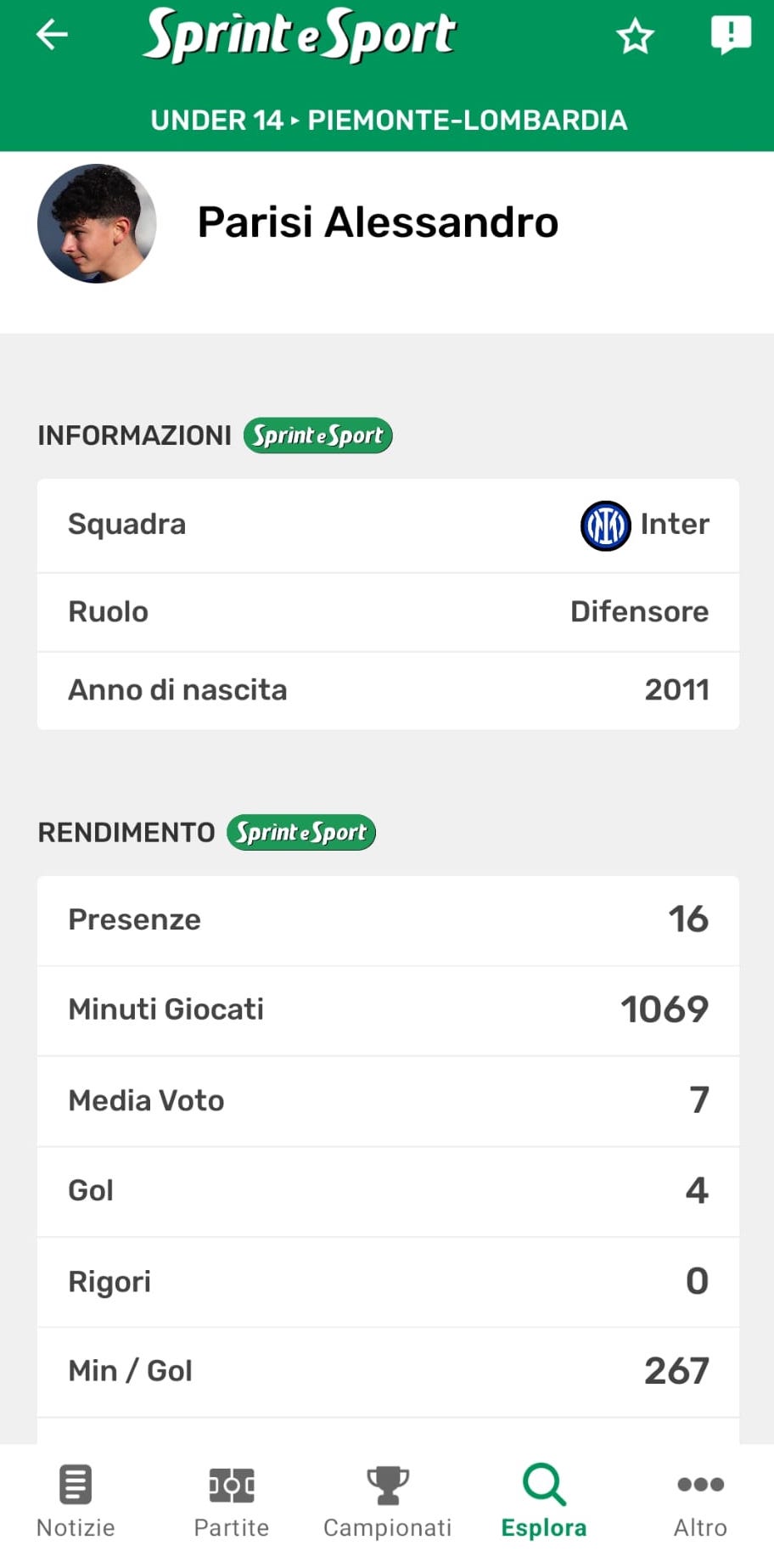 I sogni realizzati, a oggi, da Alessandro Parisi sono già due: mica male per un ragazzo così giovane. Uno riguarda appunto la tripletta segnata alla Pro Patria, l'altro risale alla scorsa stagione, quando a Tirrenia i classe 2011 dell'Inter hanno festeggiato lo Scudetto di categoria. Anche in questo caso il "mica male" è obbligatorio: intanto perché vincere un titolo non è mai una cosa semplice e scontata, e poi perché Alessandro era al primo anno con la maglia nerazzurra. Anche se lui il nerazzurro lo conosceva già bene, visto che il suo percorso - dopo aver cominciato nei Devils di Corsico ed essere passato poi al Rozzano - lo aveva portato a vestire la maglia dell'Accademia Inter prima del grande salto. Il suo idolo e riferimento è Federico Dimarco, ma come sviluppo, caratteristiche e prospettiva potrebbe essere accostato più ad Alessandro Bastoni. Il sinistro è di altissimo tasso qualitativo, la testa è quella giusta (sia come atteggiamento che come gesto tecnico… e la Pro Patria lo sa bene), e se ora si mette pure a segnare… allora il mix diventa perfetto.