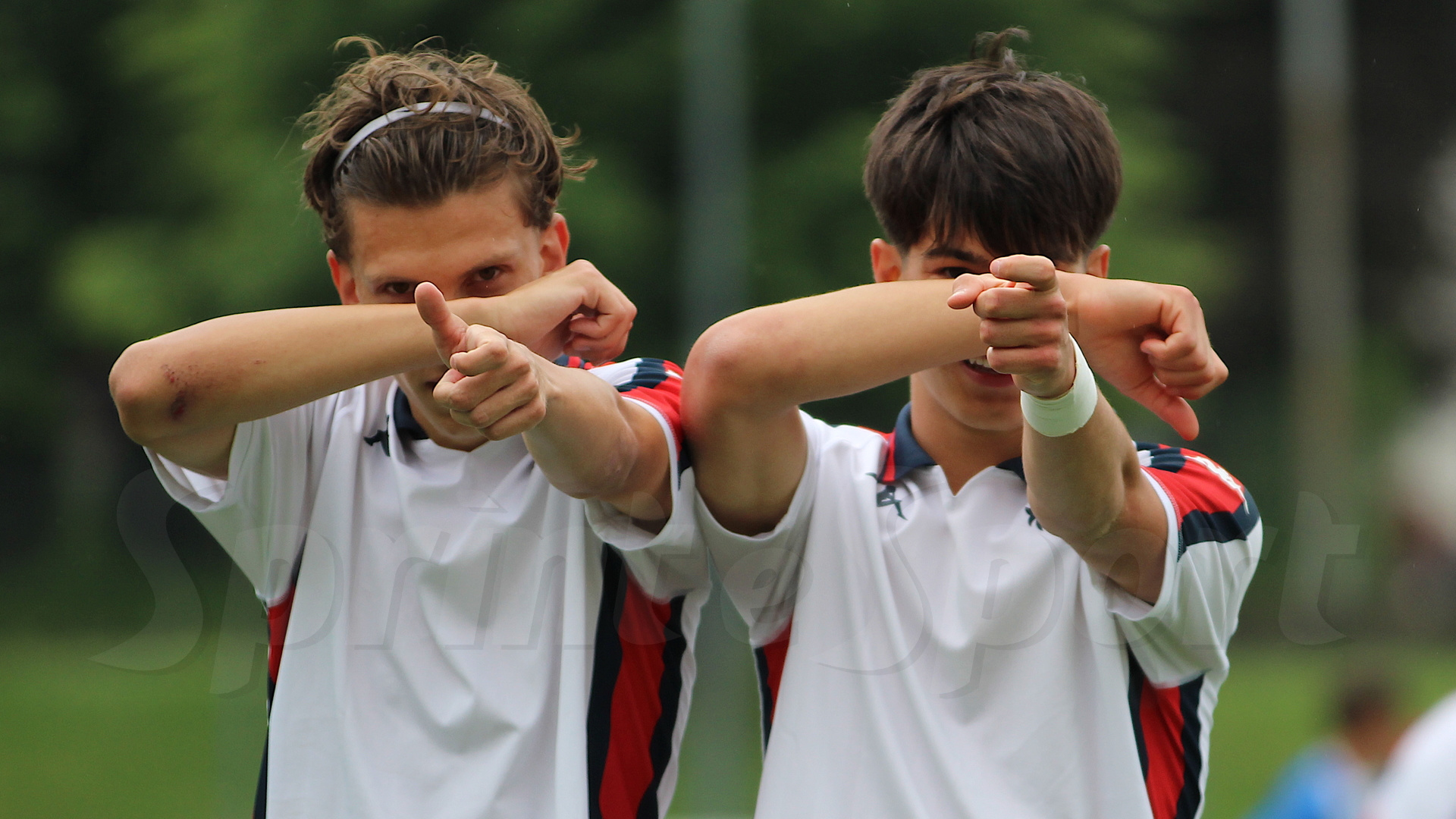 BRESCIA-GENOA UNDER 16 A-B • Gabriele Mandirola e Edoardo Acrocetti esultano dopo il gol del difensore che sblocca la partita