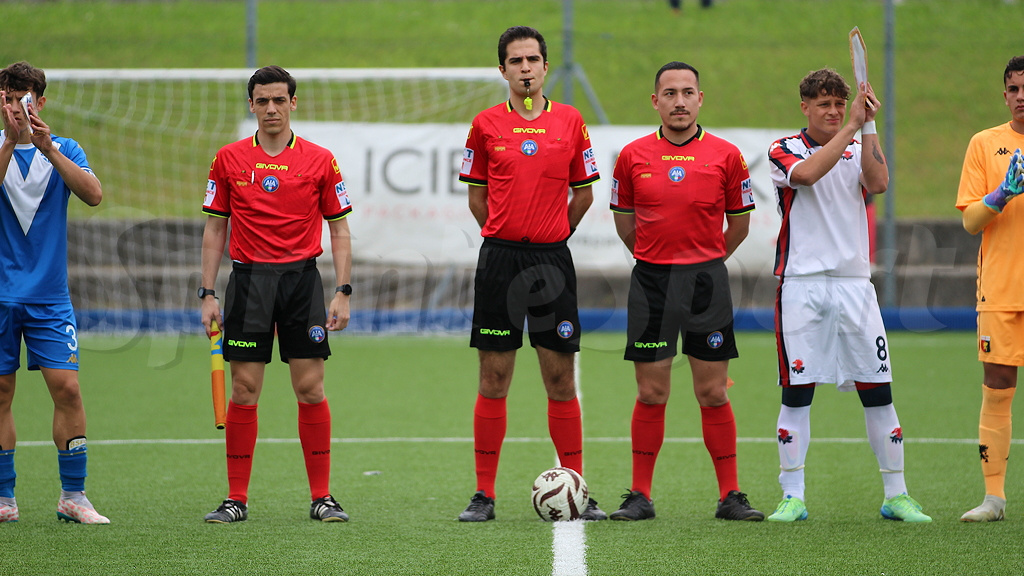 BRESCIA-GENOA UNDER 16 A-B • Il direttore di gara Dania della Sezione di Milano con i due assistenti prima del sorteggio con i capitani