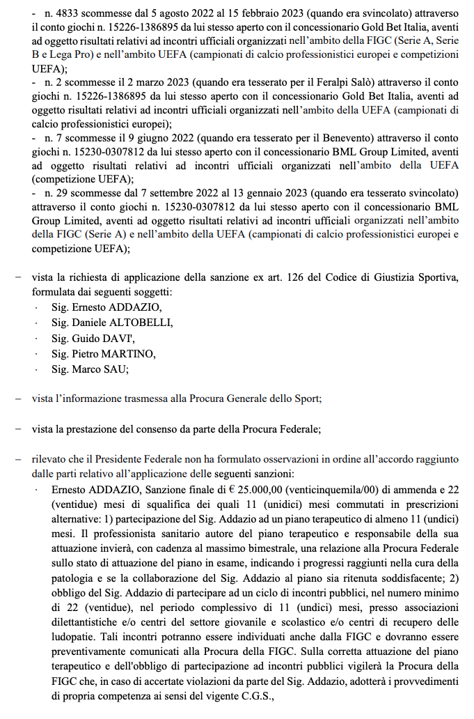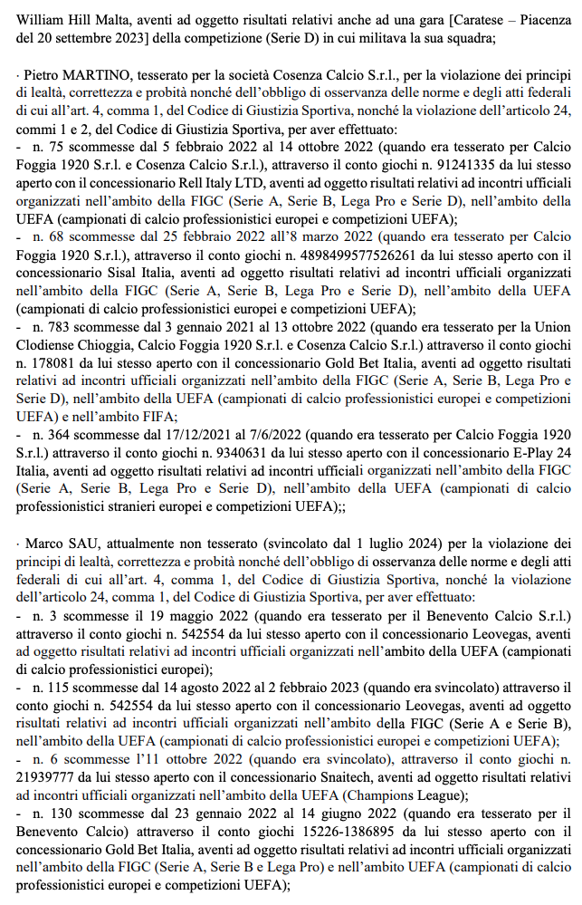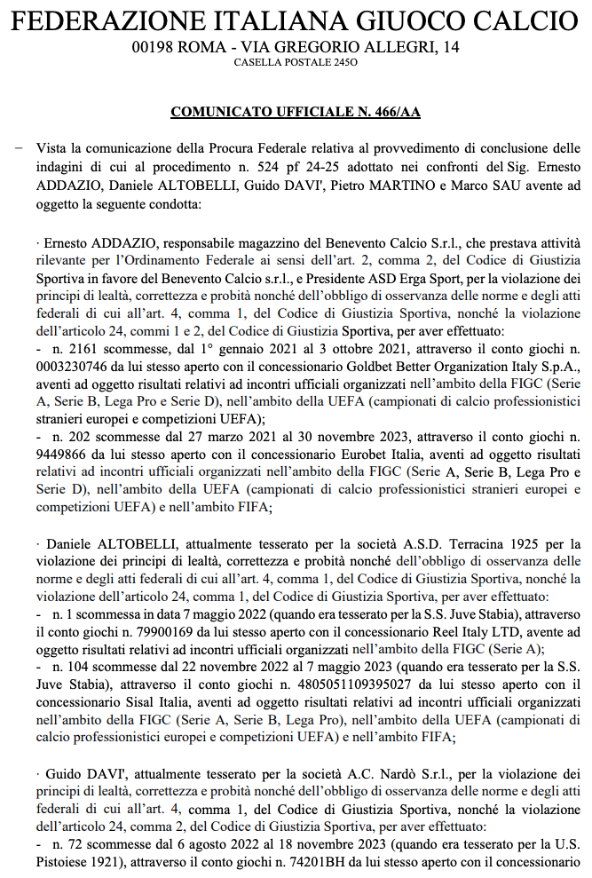 Ernesto Addazio, Daniele Altobelli, Guido Davì, Pietro Martino e Marco Sau sono loro i nomi dei personaggi coinvolti, tutti calciatori o ex calciatori fatta eccezione per Ernesto Addazio che invece ricopriva il ruolo di magazziniere di una società. Come indicato dal Comunicato, sono state decine e decine le scommesse e le puntate ricostruite e riscontrate per ognuno degli interessati e indagati. Puntate e scommesse su qualsiasi competizione nazionale e internazionale, dalle competizioni Uefa a quella della Fifa per arrivare ai campionati professionistici italiani e non solo. E arrivando fino a puntare su partite del campionato di Serie D.