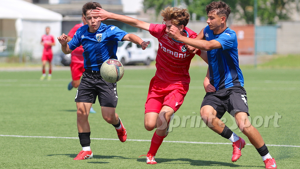 GIANA ERMINIO-RENATE UNDER 15 SERIE C • Alessandro Dorascenzi, centrocampista della Giana, stretto nella morsa tra due avversari