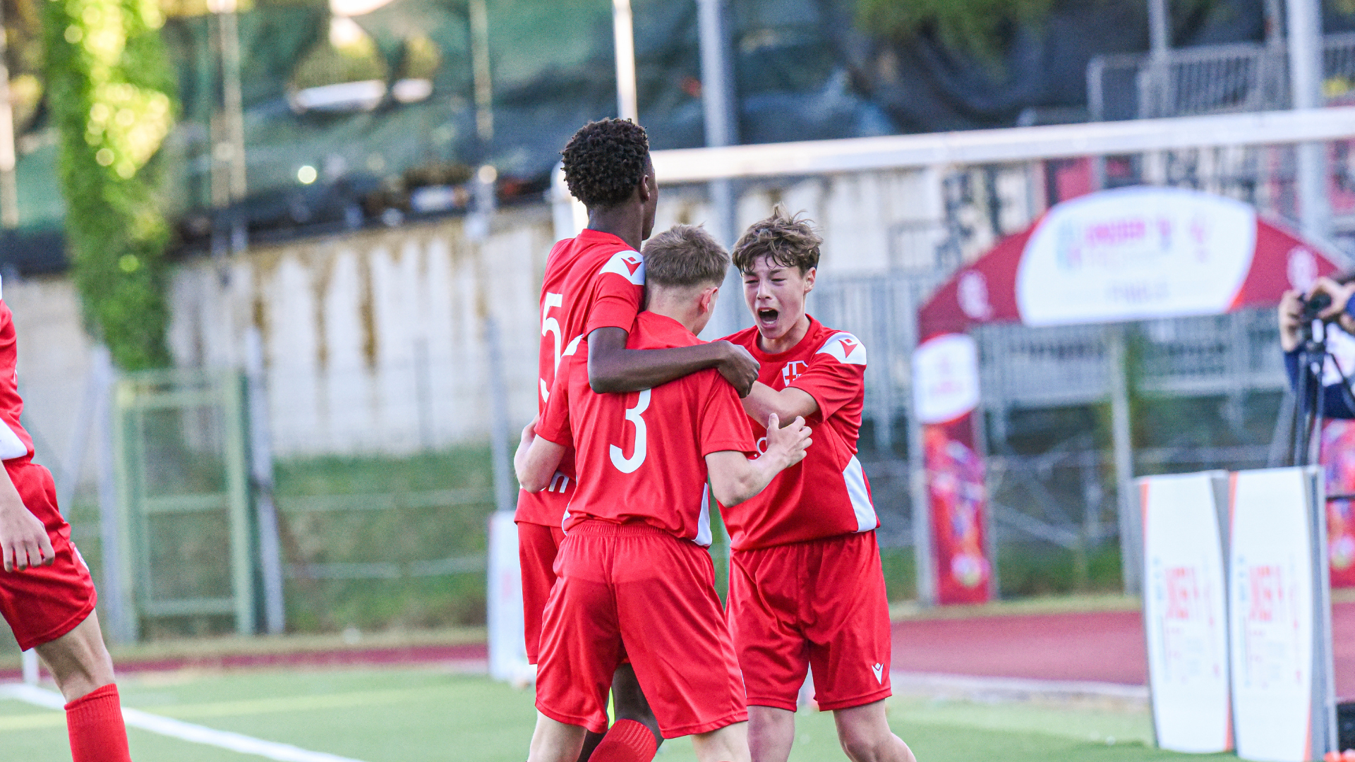 Adrien Tato che esulta con Ferraresso e Benetazzo dopo il gol del 2-2 in semifinale contro il Parma (foto figc.it)