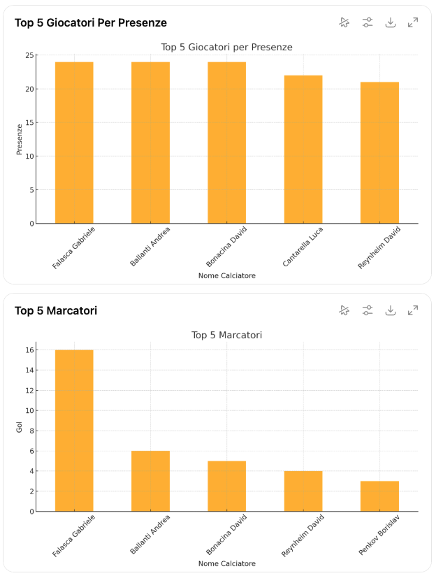 Falasca Gabriele risulta nettamente il miglior giocatore per rendimento complessivo, seguito da Ballanti Andrea e Bonacina David.
