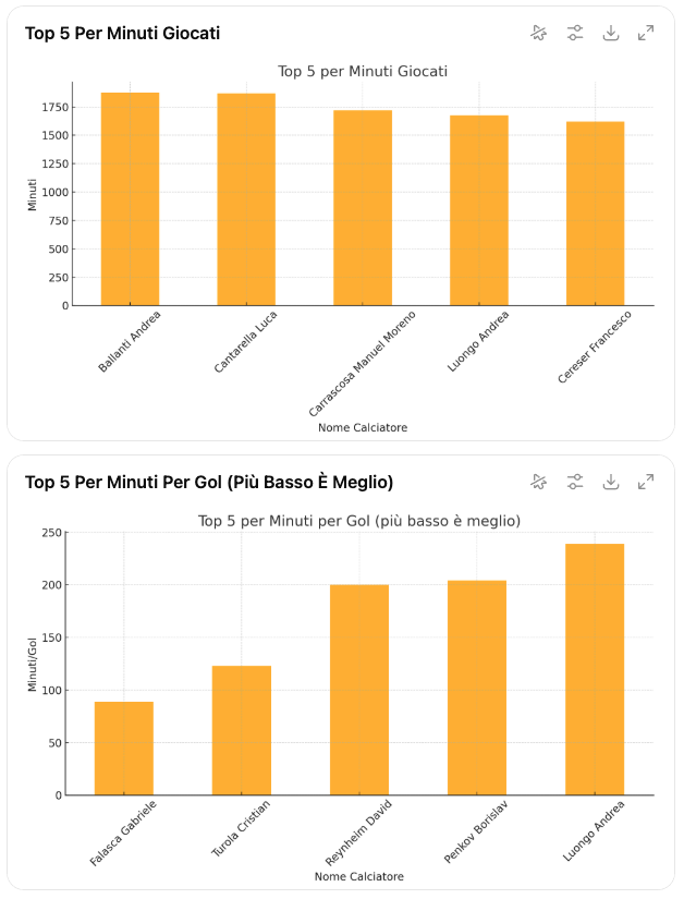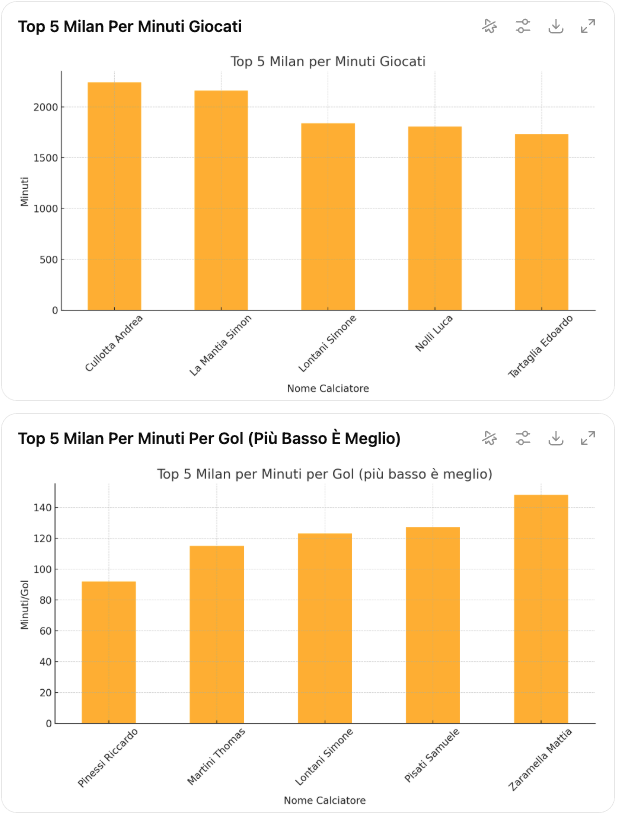 Il Milan ha segnato più gol durante la stagione (50 contro i 47 del Torino), ma è il Torino a distinguersi per efficienza offensiva, con una media di un gol ogni 446 minuti, mentre il Milan necessita di 549 minuti per andare in rete. Questo suggerisce che i granata, pur segnando meno, sanno capitalizzare meglio le occasioni.