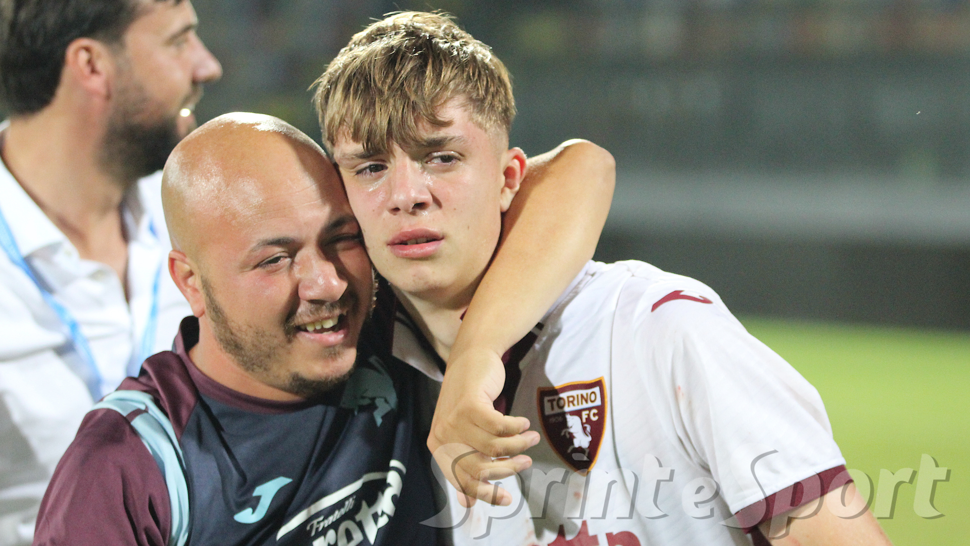 Andrea Ballanti in lacrime a fine partita con il match analyst del Torino
