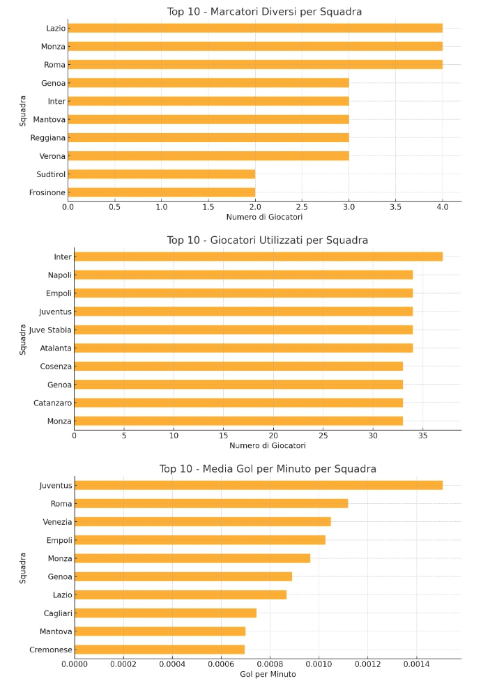 I grafici mostrano che squadre come Roma, Monza, e Lazio vantano il maggior numero di giocatori capaci di andare a segno. Questo indica una notevole distribuzione offensiva e capacità di creare pericoli da più fonti, una caratteristica fondamentale per squadre con un sistema di gioco corale e non dipendente da un singolo attaccante.