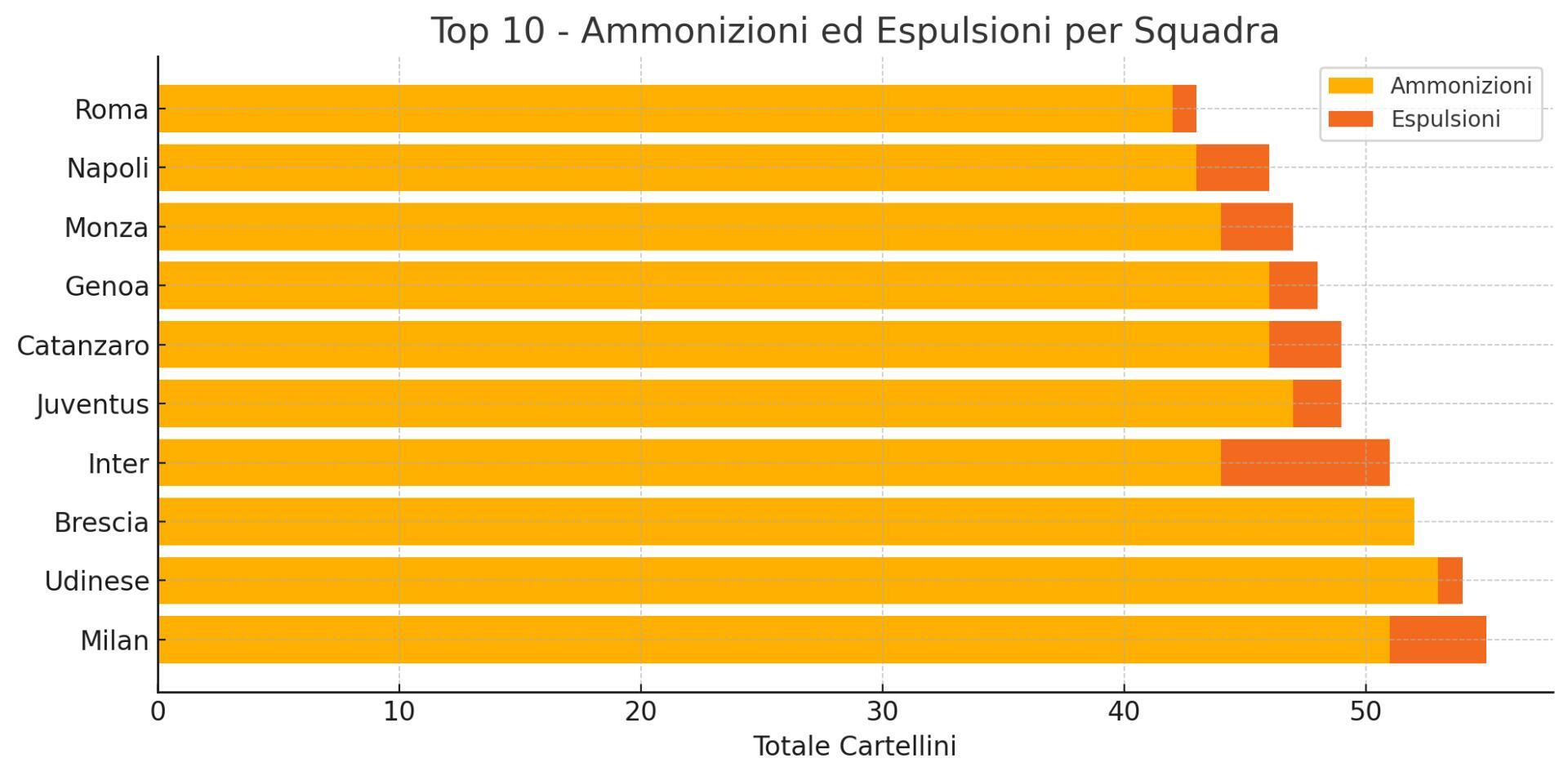Sul fronte della disciplina, Monza è in testa per cartellini totali, seguita da Roma e Verona. Il dato aggrega ammonizioni ed espulsioni, e può indicare uno stile di gioco aggressivo oppure disattenzioni difensive e tattiche. La Lazio, pur essendo tra le squadre con buoni numeri offensivi, è anche tra le più sanzionate per espulsioni.