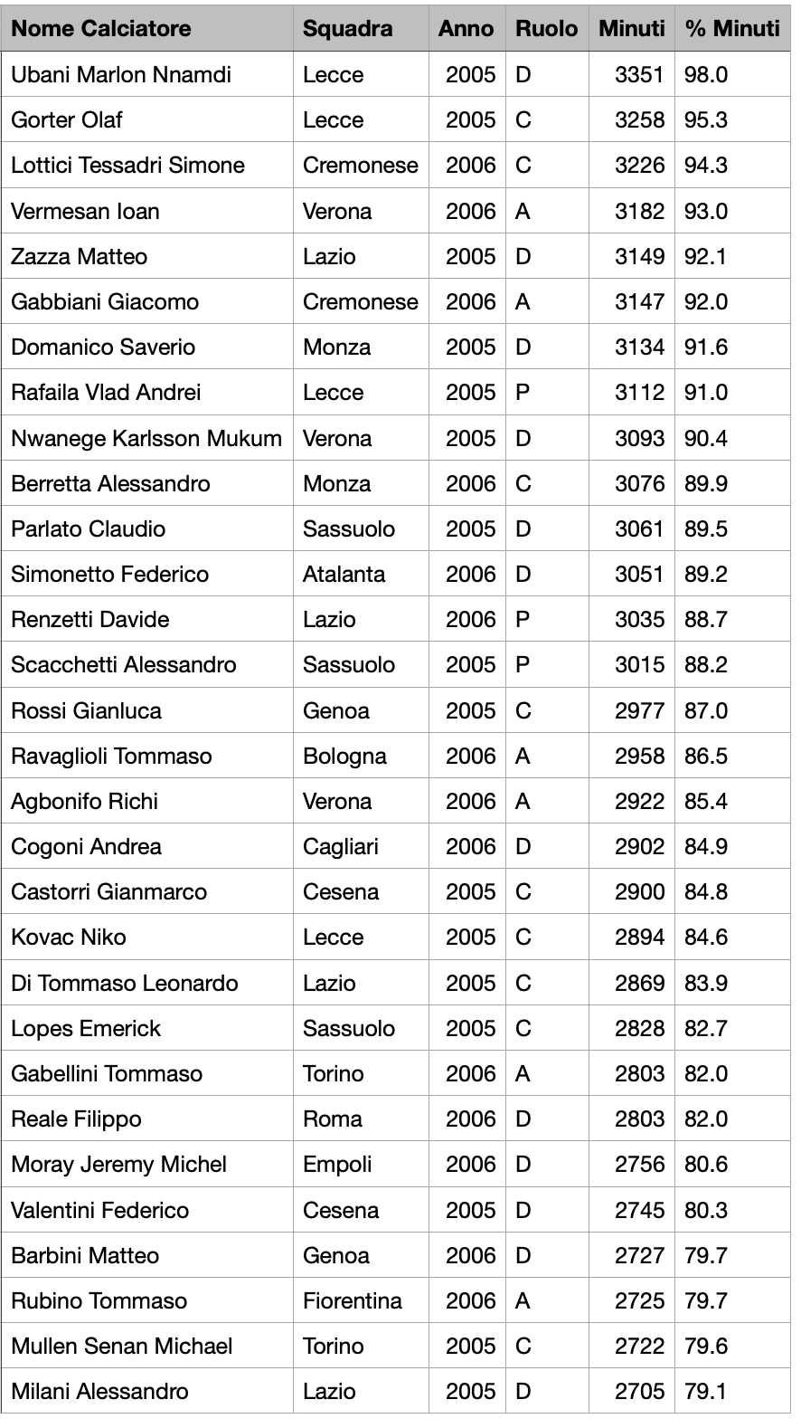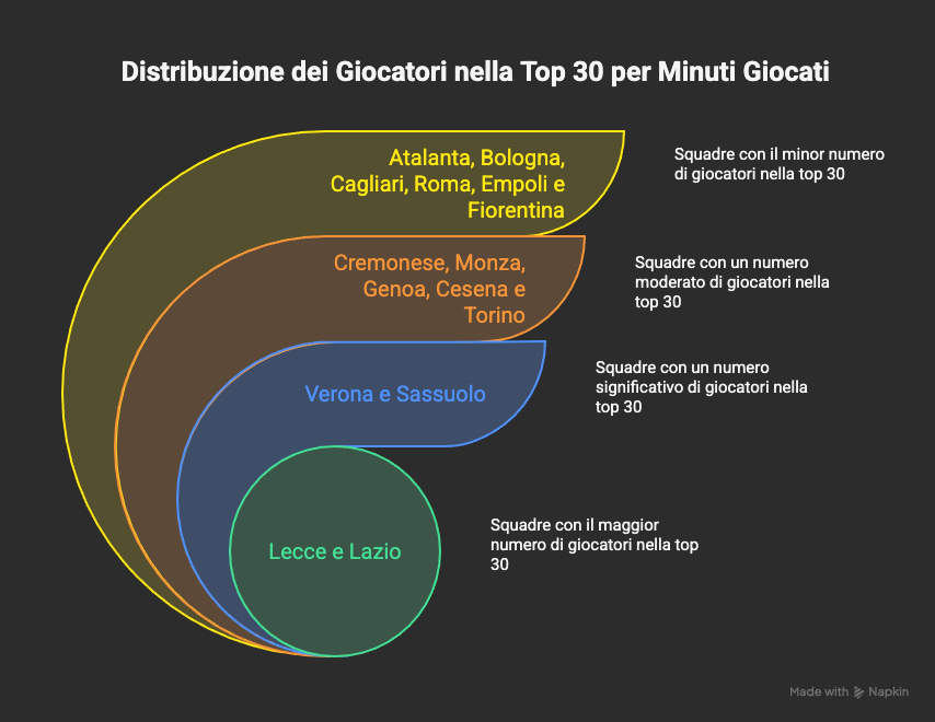 Nella mappa delle squadre che si affidano di più ai propri titolarissimi, il Lecce e la Lazio dominano: ben 4 giocatori nei primi 30 posti per minutaggio. Una conferma della solidità del progetto tecnico e della fiducia nelle gerarchie. Subito dietro Sassuolo e Verona con 3 giocatori a testa: club che evidentemente scelgono la linea della continuità piuttosto che la rotazione esasperata.