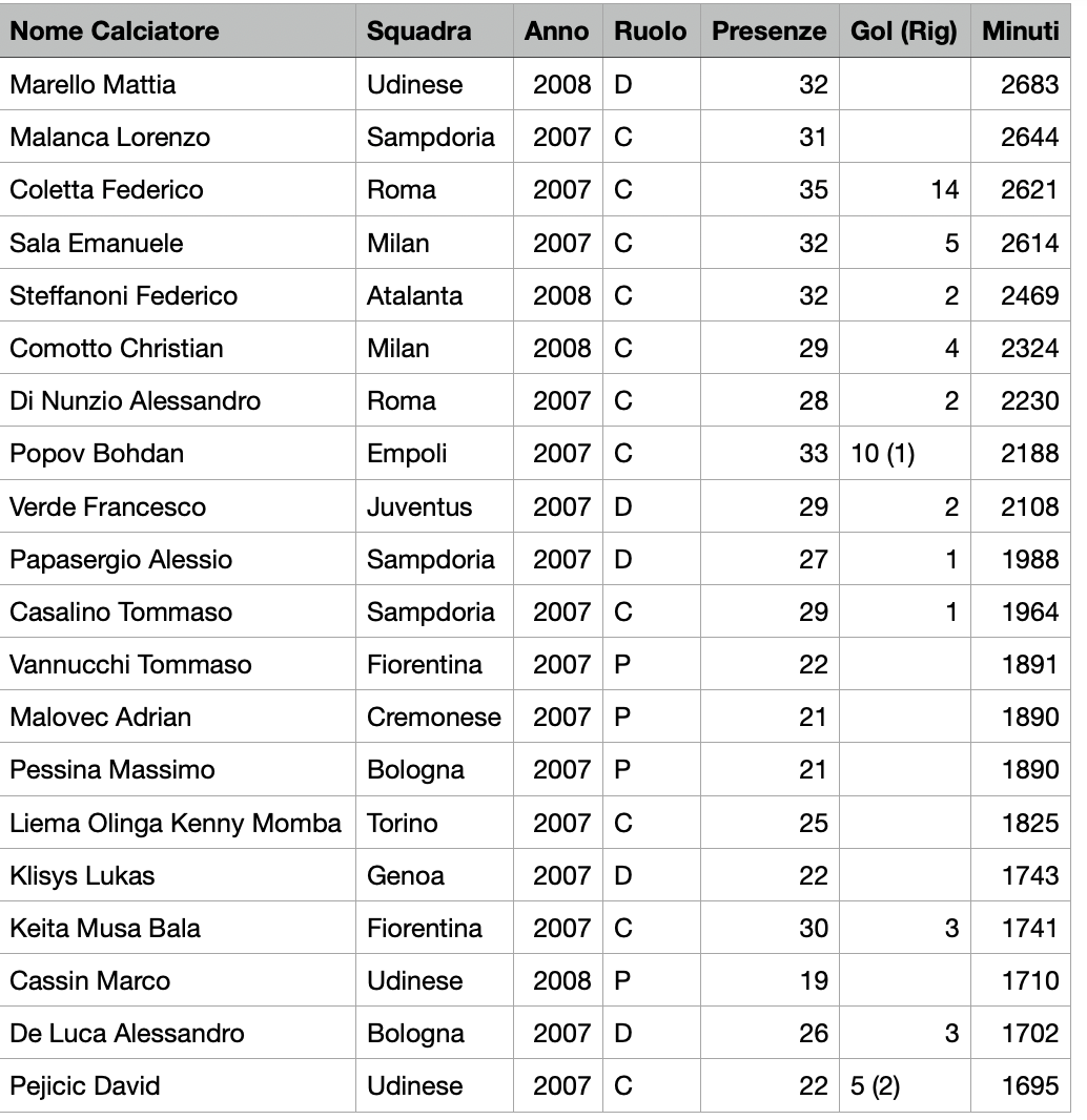 Sono comunque diversi i classe 2007 e 2008 che si sono ritagliati un ruolo da protagonisti. Ecco infatti la tabella che mostra i giovani classe 2007 e 2008 più utilizzati nel campionato Primavera 2024-25, ordinati per minuti giocati. Nonostante la giovane età, questi calciatori hanno saputo imporsi come titolari, raccogliendo spesso oltre 2500 minuti stagionali: un dato impressionante per chi affronta avversari anche di uno o due anni più grandi. In testa c’è Mattia Marello (Udinese, 2008), autentico caso di precocità con 2683 minuti giocati. A seguire, spiccano nomi come Lorenzo Malanca (Sampdoria) e Federico Coletta (Roma), entrambi 2007, a testimoniare come i club più strutturati non esitino a lanciare i propri talenti. Un dato chiaro: il futuro si gioca oggi.