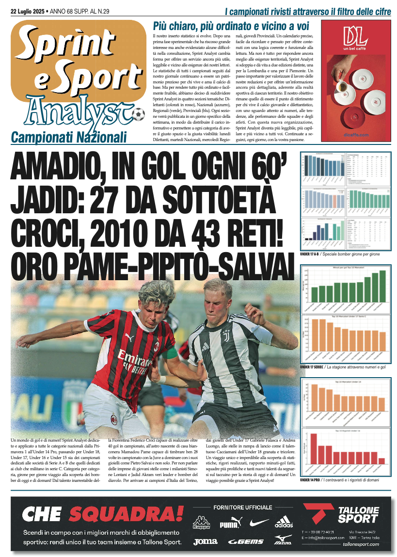 Un mondo di gol e di numeri! Sprint Analyst dedicato e applicato a tutte le categorie nazionali dalla Primavera 1 all’Under 14 Pro, passando per Under 18, Under 17, Under 16 e Under 15 sia dei campionati dedicati alle società di Serie A e B che quelli dedicati ai club che militano in serie C. Categoria per categoria, girone per girone viaggio alla scoperta dei bomber di oggi e di domani! Dal talento inarrestabile della Fiorentina Federico Croci capace di realizzare oltre 40 gol in campionato, all’astro nascente di casa bianconera Mamadou Pame capace di timbrare ben 28 volte in campionato con la Juve a dominare con i suoi gioielli come Pietro Salvai e non solo.
