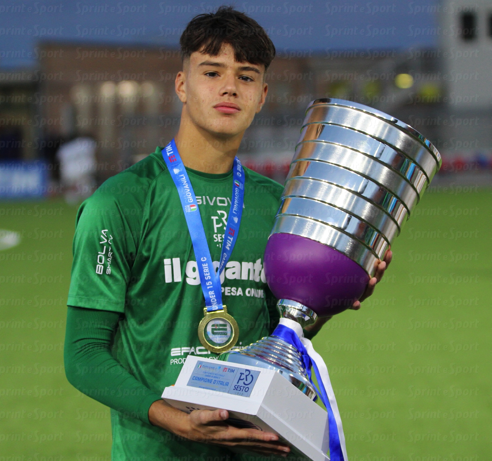 È il 26 giugno 2024: Andrea Lini posa con la coppa dello Scudetto Under 15 vinto da protagonista assoluto con la sua Pro Sesto