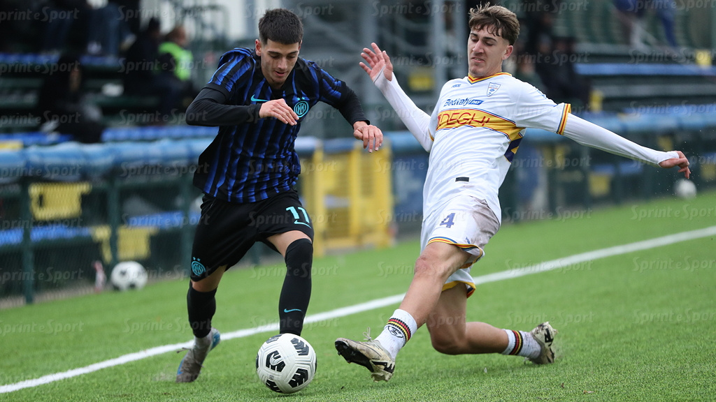 INTER-LECCE UNDER 18 • Vukaj parte dalla fascia destra e prova a sfondare, Palmieri interviene in scivolata per limitarlo