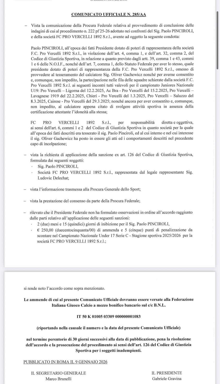 La FIGC ha ufficializzato, con il Comunicato n. 285/AA pubblicato il 9 gennaio 2026, l’accordo sanzionatorio raggiunto tra la Procura Federale, il presidente Paolo Pinciroli e la società FC Pro Vercelli 1892 S.r.l. al termine dell’indagine relativa all’impiego irregolare di un calciatore nel campionato Juniores Nazionale Under 19.